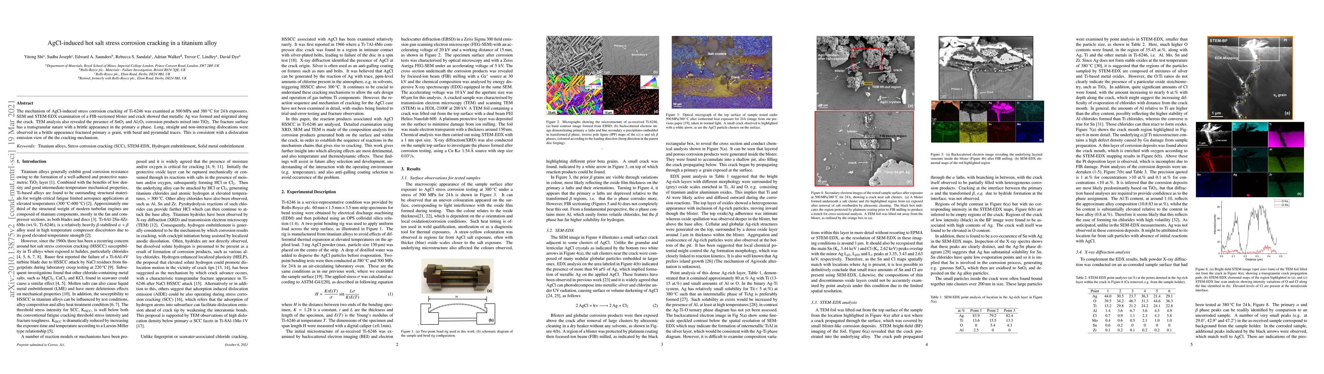 This study investigates AgCl-induced stress corrosion cracking in Ti-6246 titanium alloy, revealing metallic Ag migration along cracks and the formation of SnO2, Al2O3, and TiO2 corrosion products. The fracture surface exhibits transgranular, brittle failure in the α phase, with straight dislocations indicating a dislocation emission mechanism.