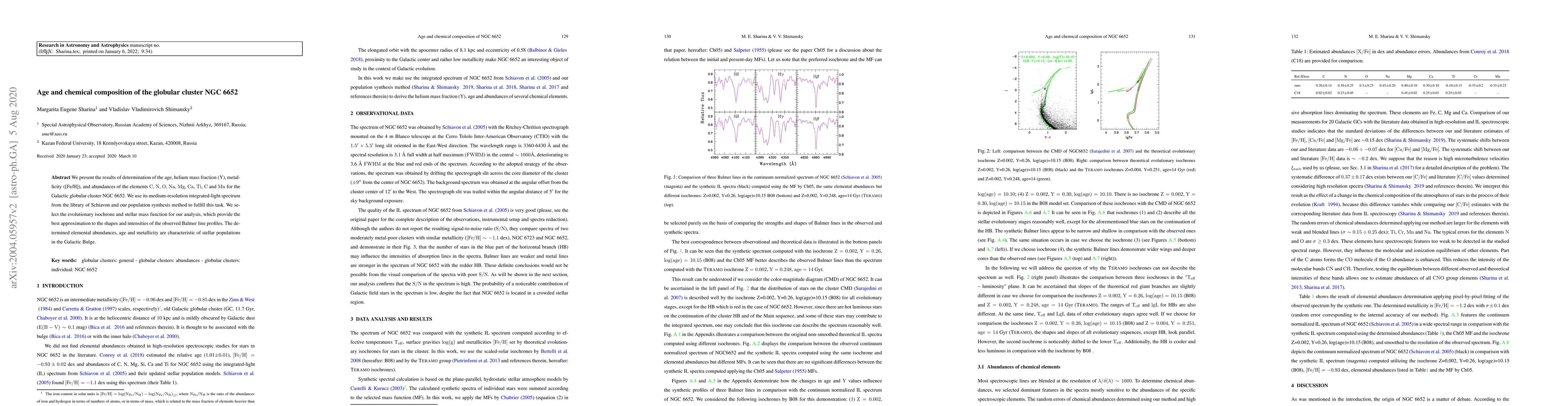 We present the results of determination of the age, helium mass fraction (Y), metallicity ([Fe/H]), and abundances of the elements C, N, O, Na, Mg, Ca, Ti, C and Mn for the Galactic globular cluster NGC 6652. We use its medium-resolution integrated-light spectrum from the library of Schiavon and our population synthesis method to fulfill this task. We select the evolutionary isochrone and stellar mass function for our analysis, which provide the best approximation to the shapes and intensities of the observed Balmer line profiles. The determined elemental abundances, age and metallicity are characteristic of stellar populations in the Galactic Bulge.