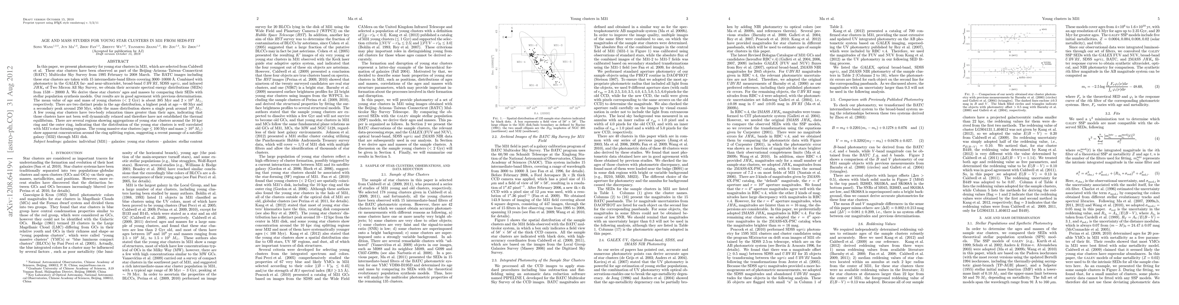 In this paper, we present photometry for young star clusters in M31, which are selected from Caldwell et al. These star clusters have been observed as part of the Beijing--Arizona--Taiwan--Connecticut (BATC) Multicolor Sky Survey from 1995 February to 2008 March. The BATC images including these star clusters are taken with 15 intermediate-band filters covering 3000--10000 \AA. Combined with photometry in the {\sl GALEX} far- and near-ultraviolet, broad-band $UBVRI$, SDSS $ugriz$, and infrared $JHK_{\rm s}$ of Two Micron All Sky Survey, we obtain their accurate spectral energy distributions (SEDs) from 1538-20000 \AA. We derive these star clusters' ages and masses by comparing their SEDs with stellar population synthesis models. Our results are in good agreement with previous determinations. The mean value of age and mass of young clusters ($<2$ Gyr) is about 385 Myr and $2\times 10^4 {M_\odot}$, respectively. There are two distinct peaks in the age distribution, a highest peak at age $\sim$ 60 Myr and a secondary peak around 250 Myr, while the mass distribution shows a single peak around $10^4 {M_\odot}$. A few young star clusters have two-body relaxation times greater than their ages, indicating that those clusters have not been well dynamically relaxed and therefore have not established the thermal equilibrium. There are several regions showing aggregations of young star clusters around the 10 kpc ring and the outer ring, indicating that the distribution of the young star clusters is well correlated with M31's star-forming regions. The young massive star clusters (age $\leq 100$ Myr and mass $\geq 10^4 {M_\odot}$) show apparent concentration around the ring splitting region, suggesting a recent passage of a satellite galaxy (M32) through M31 disk.