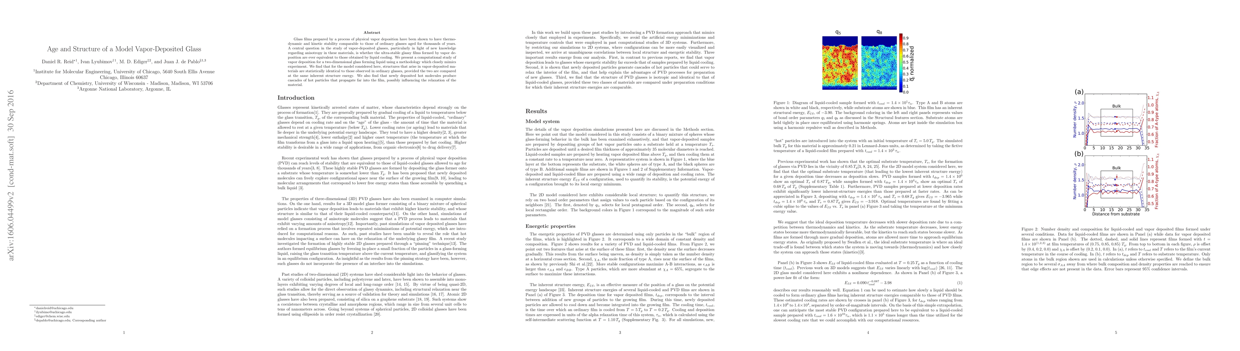 Glass films prepared by a process of physical vapor deposition have been shown to have thermodynamic and kinetic stability comparable to those of ordinary glasses aged for thousands of years. A central question in the study of vapor-deposited glasses, particularly in light of new knowledge regarding anisotropy in these materials, is whether the ultra-stable glassy films formed by vapor deposition are ever equivalent to those obtained by liquid cooling. We present a computational study of vapor deposition for a two-dimensional glass forming liquid using a methodology which closely mimics experiment. We find that for the model considered here, structures that arise in vapor-deposited materials are statistically identical to those observed in ordinary glasses, provided the two are compared at the same inherent structure energy. We also find that newly deposited hot molecules produce cascades of hot particles that propagate far into the film, possibly influencing the relaxation of the material.