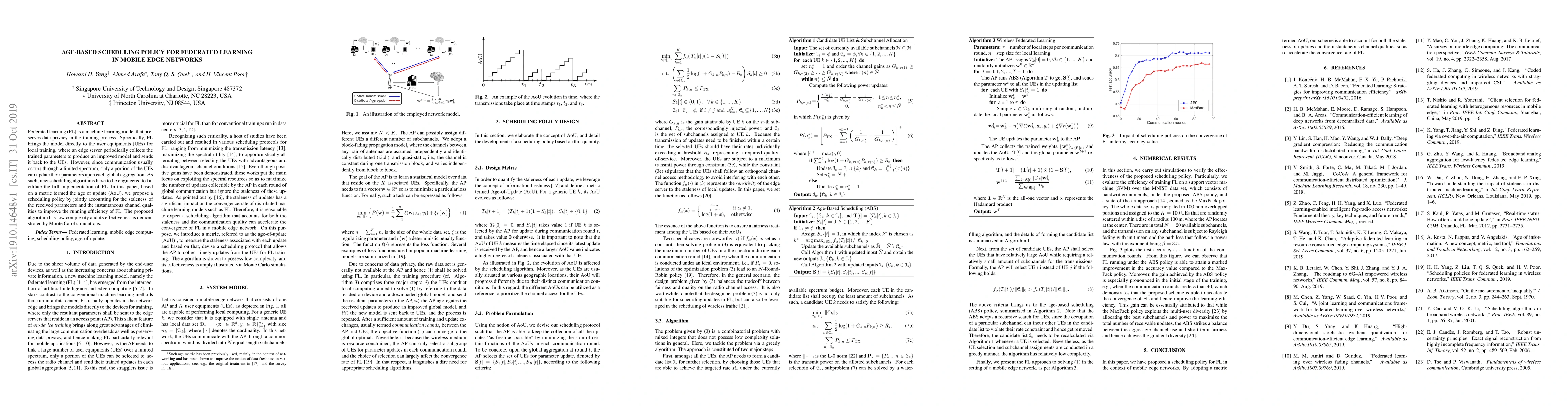 This paper proposes an age-based scheduling policy for federated learning in mobile edge networks, aiming to optimize the selection of user equipments for local training based on the age of update and channel quality. The algorithm demonstrates improved efficiency and low complexity, validated through Monte Carlo simulations.