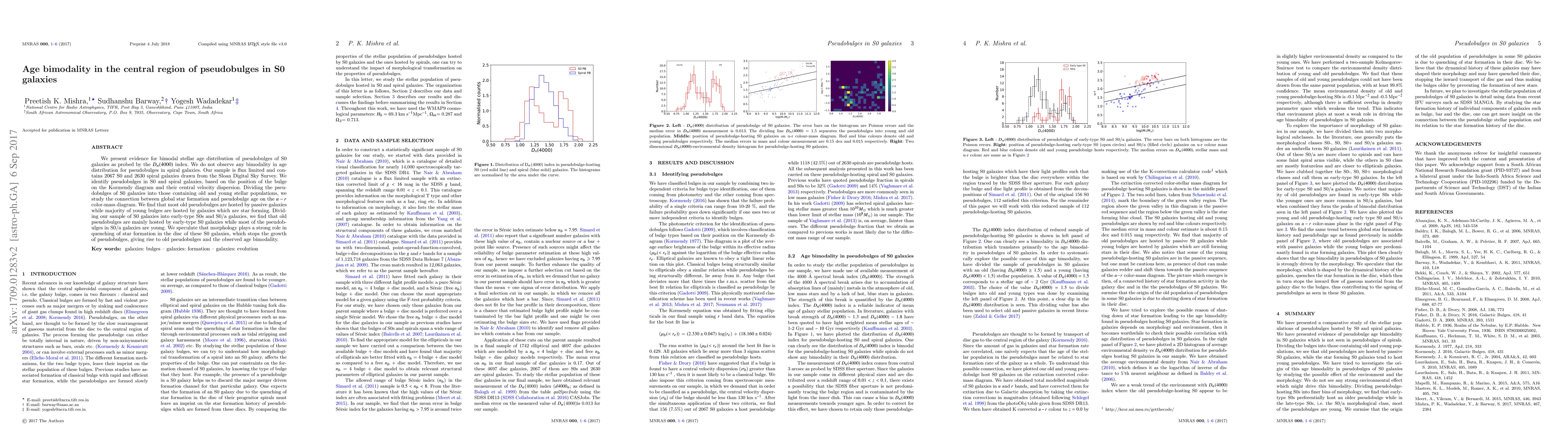 We present evidence for bimodal stellar age distribution of pseudobulges of S0 galaxies as probed by the $D_n(4000)$ index. We do not observe any bimodality in age distribution for pseudobulges in spiral galaxies. Our sample is flux limited and contains 2067 S0 and 2630 spiral galaxies drawn from the Sloan Digital Sky Survey. We identify pseudobulges in S0 and spiral galaxies, based on the position of the bulge on the Kormendy diagram and their central velocity dispersion. Dividing the pseudobulges of S0 galaxies into those containing old and young stellar populations, we study the connection between global star formation and pseudobulge age on the $u-r$ color-mass diagram. We find that most old pseudobulges are hosted by passive galaxies while majority of young bulges are hosted by galaxies which are star forming. Dividing our sample of S0 galaxies into early-type S0s and S0/a galaxies, we find that old pseudobulges are mainly hosted by early-type S0 galaxies while most of the pseudobulges in S0/a galaxies are young. We speculate that morphology plays a strong role in quenching of star formation in the disc of these S0 galaxies, which stops the growth of pseudobulges, giving rise to old pseudobulges and the observed age bimodality.