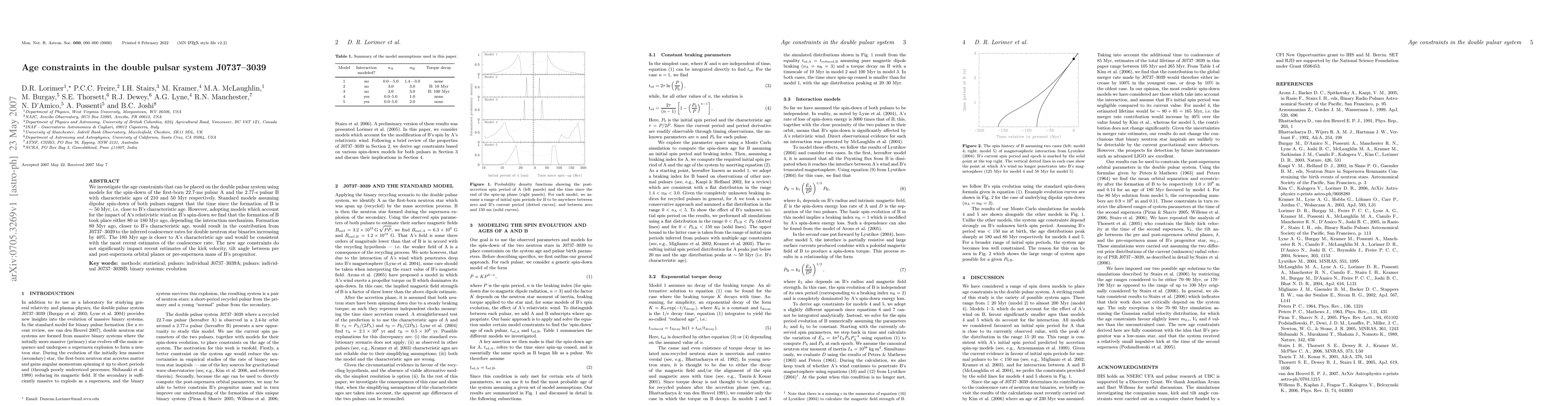 We investigate the age constraints that can be placed on the double pulsar system using models for the spin-down of the first-born 22.7-ms pulsar A and the 2.77-s pulsar B with characteristic ages of 210 and 50 Myr respectively. Standard models assuming dipolar spin-down of both pulsars suggest that the time since the formation of B is ~50 Myr, i.e. close to B's characteristic age. However, adopting models which account for the impact of A's relativistic wind on B's spin-down we find that the formation of B took place either 80 or 180 Myr ago, depending the interaction mechanism. Formation 80 Myr ago, closer to B's characteristic age, would result in the contribution from J0737-3039 to the inferred coalescence rates for double neutron star binaries increasing by 40%. The 180 Myr age is closer to A's characteristic age and would be consistent with the most recent estimates of the coalescence rate. The new age constraints do not significantly impact recent estimates of the kick velocity, tilt angle between pre and post-supernova orbital planes or pre-supernova mass of B's progenitor.