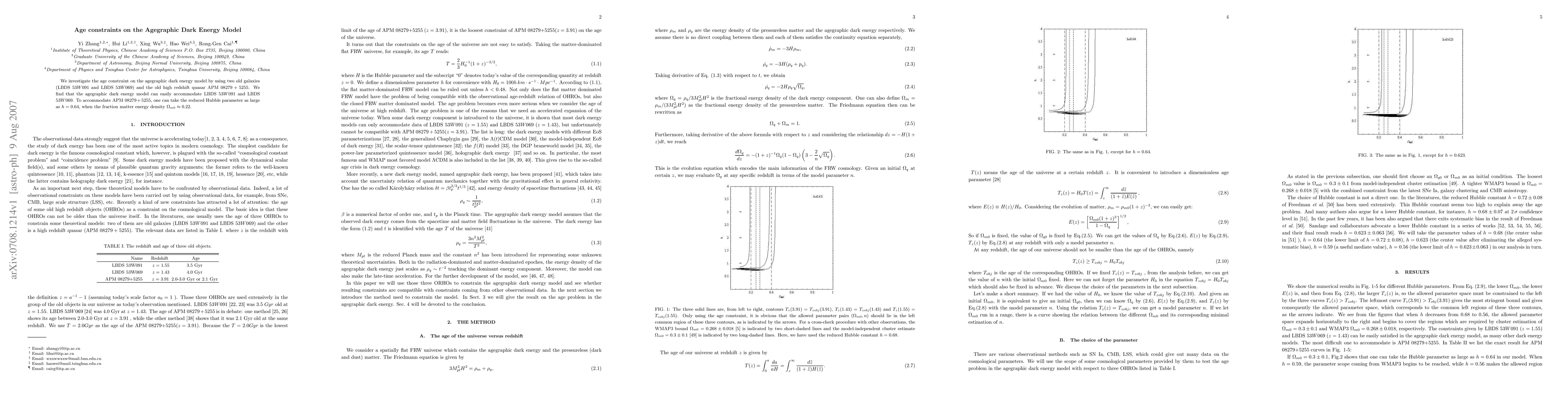 This paper examines the age constraint of the agegraphic dark energy model using observations from two old galaxies and an old high-redshift quasar. It finds that the model accommodates the galaxies well but requires a larger reduced Hubble parameter to fit the quasar data.