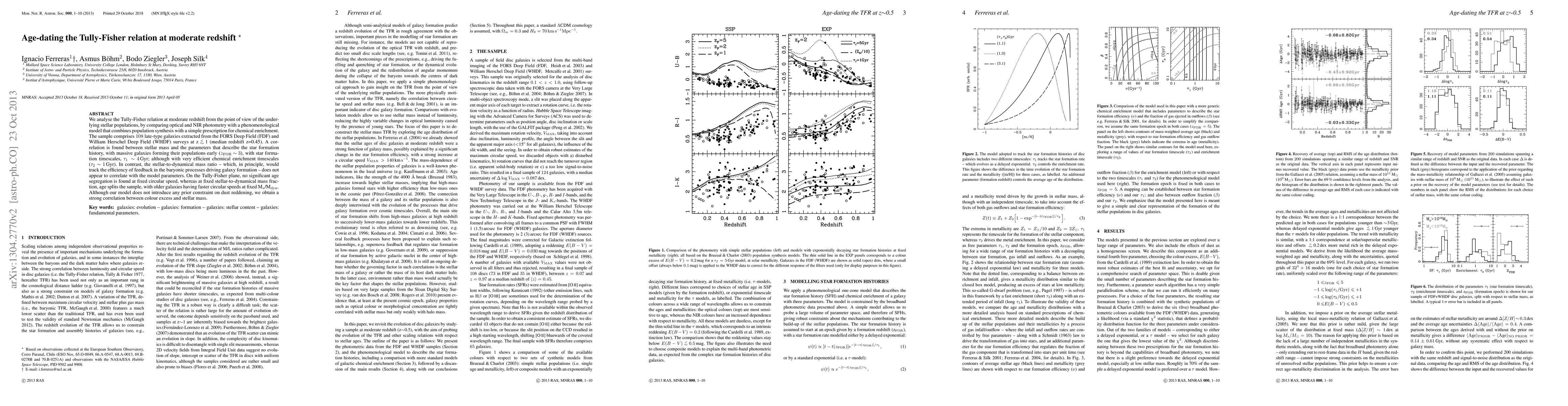 We analyse the Tully-Fisher relation at moderate redshift from the point of view of the underlying stellar populations, by comparing optical and NIR photometry with a phenomenological model that combines population synthesis with a simple prescription for chemical enrichment. The sample comprises 108 late-type galaxies extracted from the FORS Deep Field (FDF) and William Herschel Deep Field (WHDF) surveys at z<1 (median redshift z=0.45). A correlation is found between stellar mass and the parameters that describe the star formation history, with massive galaxies forming their populations early (zFOR~3), with star formation timescales, tau1~4Gyr; although with very efficient chemical enrichment timescales (tau2~1Gyr). In contrast, the stellar-to-dynamical mass ratio - which, in principle, would track the efficiency of feedback in the baryonic processes driving galaxy formation - does not appear to correlate with the model parameters. On the Tully-Fisher plane, no significant age segregation is found at fixed circular speed, whereas at fixed stellar-to-dynamical mass fraction, age splits the sample, with older galaxies having faster circular speeds at fixed Ms/Mdyn. Although our model does not introduce any prior constraint on dust reddening, we obtain a strong correlation between colour excess and stellar mass.
