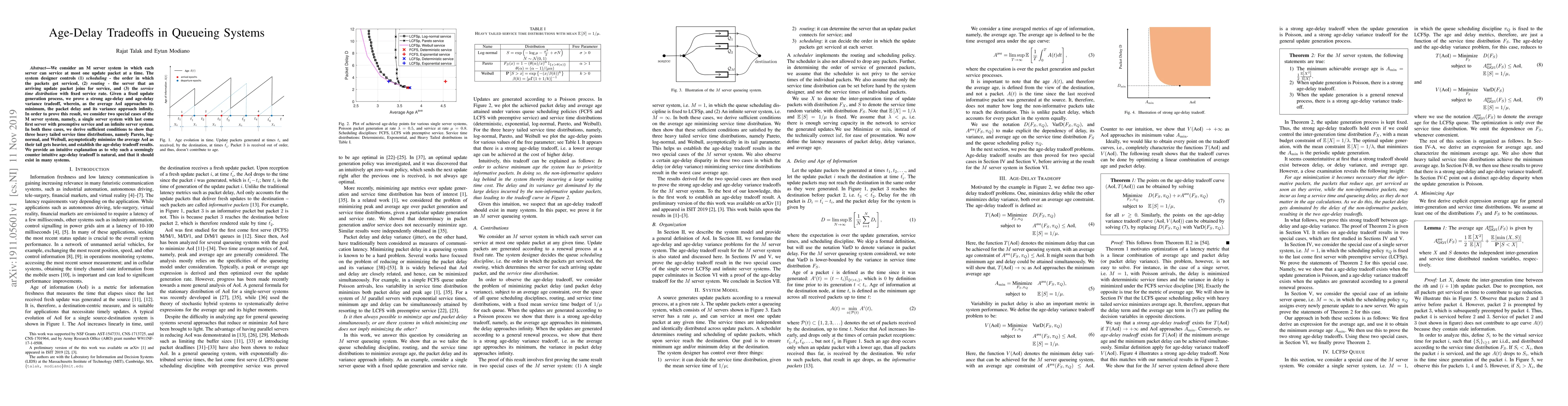 We consider an M server system in which each server can service at most one update packet at a time. The system designer controls (1) scheduling - the order in which the packets get serviced, (2) routing - the server that an arriving update packet joins for service, and (3) the service time distribution with fixed service rate. Given a fixed update generation process, we prove a strong age-delay and age-delay variance tradeoff, wherein, as the average AoI approaches its minimum, the packet delay and its variance approach infinity. In order to prove this result, we consider two special cases of the M server system, namely, a single server system with last come first server with preemptive service and an infinite server system. In both these cases, we derive sufficient conditions to show that three heavy tailed service time distributions, namely Pareto, log-normal, and Weibull, asymptotically minimize the average AoI as their tail gets heavier, and establish the age-delay tradeoff results. We provide an intuitive explanation as to why such a seemingly counter intuitive age-delay tradeoff is natural, and that it should exist in many systems.