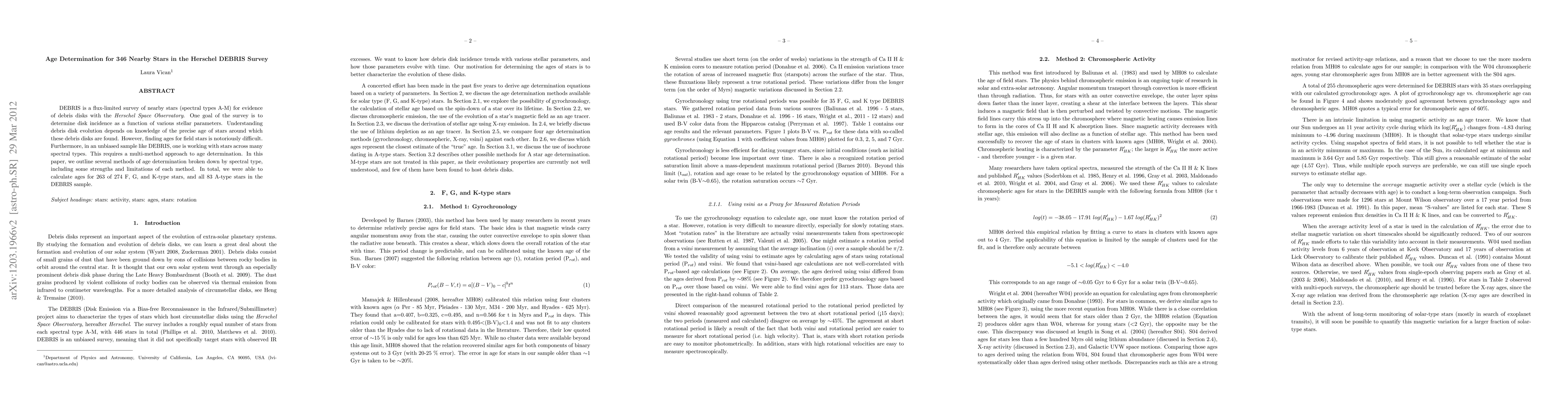 This paper presents a multi-method approach to determine the ages of 346 nearby stars from the Herschel DEBRIS Survey, focusing on spectral types A-M. The study successfully calculated ages for 263 of the 274 F, G, and K-type stars, and all 83 A-type stars, highlighting the strengths and limitations of each age determination method used.