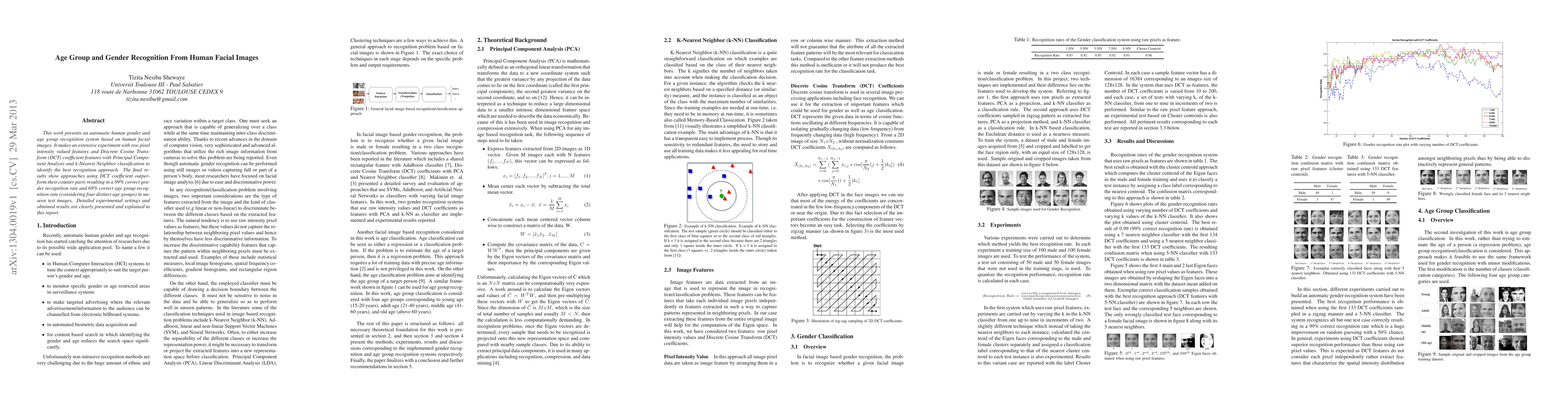 This work presents an automatic human gender and age group recognition system based on human facial images. It makes an extensive experiment with row pixel intensity valued features and Discrete Cosine Transform (DCT) coefficient features with Principal Component Analysis and k-Nearest Neighbor classification to identify the best recognition approach. The final results show approaches using DCT coefficient outperform their counter parts resulting in a 99% correct gender recognition rate and 68% correct age group recognition rate (considering four distinct age groups) in unseen test images. Detailed experimental settings and obtained results are clearly presented and explained in this report.