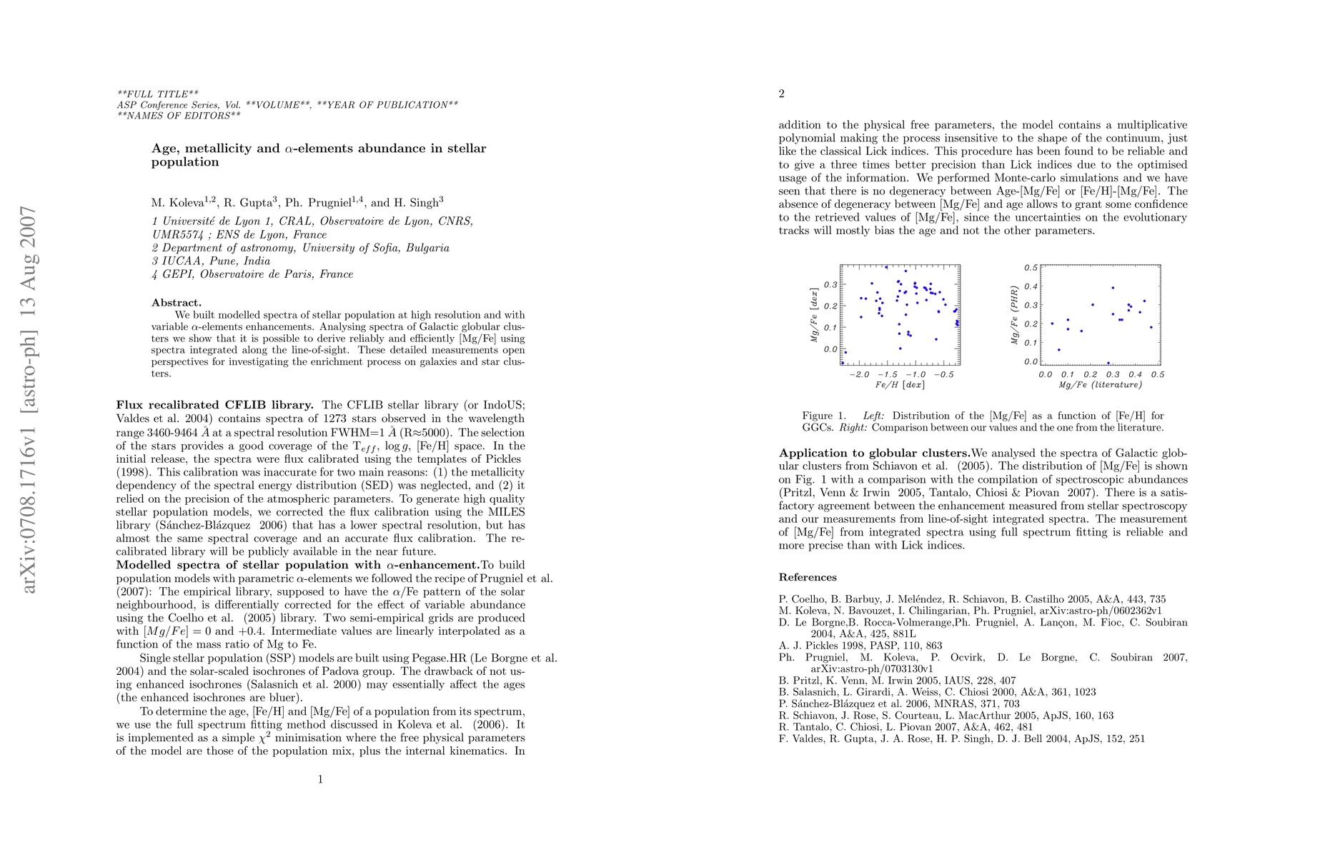 We built modelled spectra of stellar population at high resolution and with variable alpha-elements enhancements. Analysing spectra of Galactic globular clusters we show that it is possible to derive reliably and efficiently [Mg/Fe] using spectra integrated along the line-of-sight. These detailed measurements open perspectives for investigating the enrichment process on galaxies and star clusters.