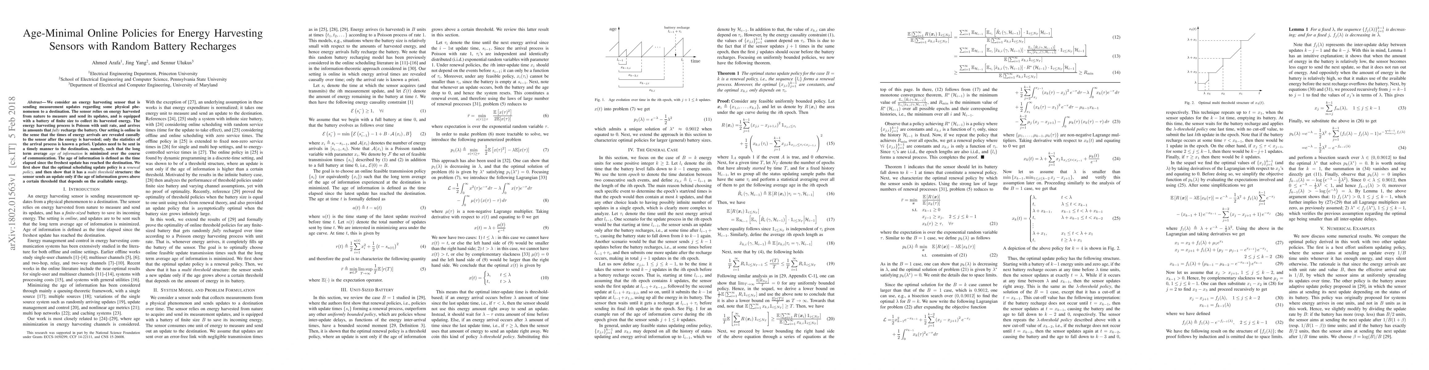 This paper investigates optimal online policies for energy harvesting sensors to minimize the long-term average age of information, given random battery recharges. The authors determine that the best update scheduling follows a multi-threshold renewal policy based on the available energy and the age of information.