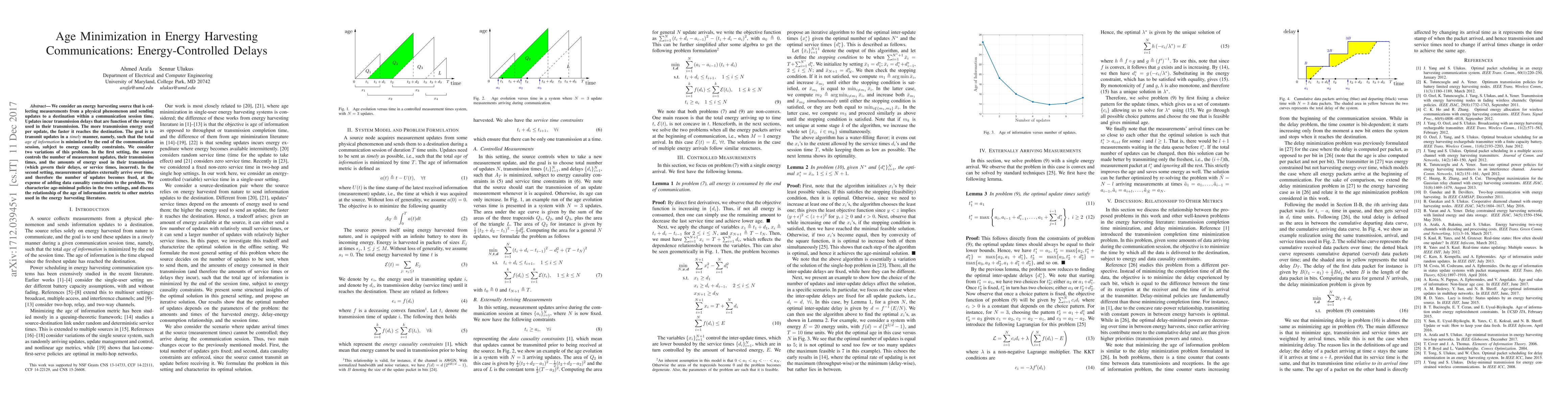 We consider an energy harvesting source that is collecting measurements from a physical phenomenon and sending updates to a destination within a communication session time. Updates incur transmission delays that are function of the energy used in their transmission. The more transmission energy used per update, the faster it reaches the destination. The goal is to transmit updates in a timely manner, namely, such that the total age of information is minimized by the end of the communication session, subject to energy causality constraints. We consider two variations of this problem. In the first setting, the source controls the number of measurement updates, their transmission times, and the amounts of energy used in their transmission (which govern their delays, or service times, incurred). In the second setting, measurement updates externally arrive over time, and therefore the number of updates becomes fixed, at the expense of adding data causality constraints to the problem. We characterize age-minimal policies in the two settings, and discuss the relationship of the age of information metric to other metrics used in the energy harvesting literature.