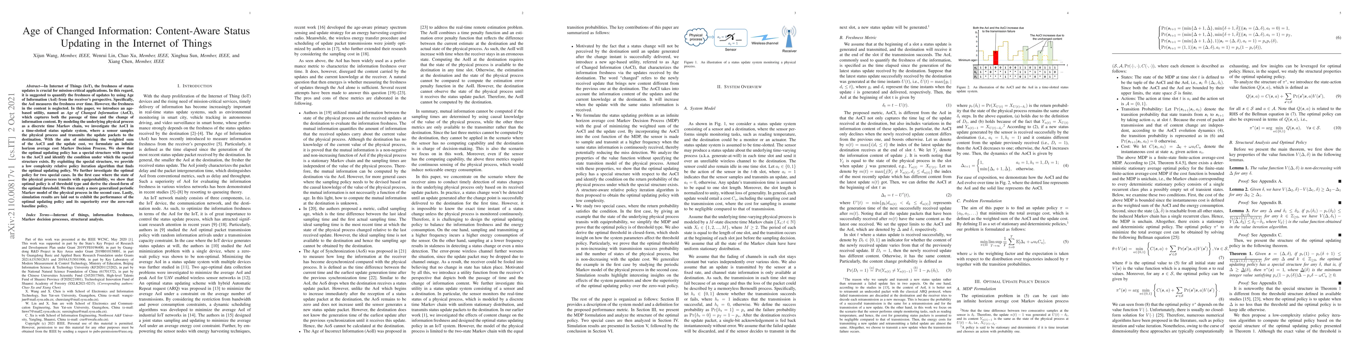In Internet of Things (IoT), the freshness of status updates is crucial for mission-critical applications. In this regard, it is suggested to quantify the freshness of updates by using Age of Information (AoI) from the receiver's perspective. Specifically, the AoI measures the freshness over time. However, the freshness in the content is neglected. In this paper, we introduce an age-based utility, named as Age of Changed Information (AoCI), which captures both the passage of time and the change of information content. By modeling the underlying physical process as a discrete time Markov chain, we investigate the AoCI in a time-slotted status update system, where a sensor samples the physical process and transmits the update packets to the destination. With the aim of minimizing the weighted sum of the AoCI and the update cost, we formulate an infinite horizon average cost Markov Decision Process. We show that the optimal updating policy has a special structure with respect to the AoCI and identify the condition under which the special structure exists. By exploiting the special structure, we provide a low complexity relative policy iteration algorithm that finds the optimal updating policy. We further investigate the optimal policy for two special cases. In the first case where the state of the physical process transits with equiprobability, we show that optimal policy is of threshold type and derive the closed-form of the optimal threshold. We then study a more generalized periodic Markov model of the physical process in the second case. Lastly, simulation results are laid out to exhibit the performance of the optimal updating policy and its superiority over the zero-wait baseline policy.
