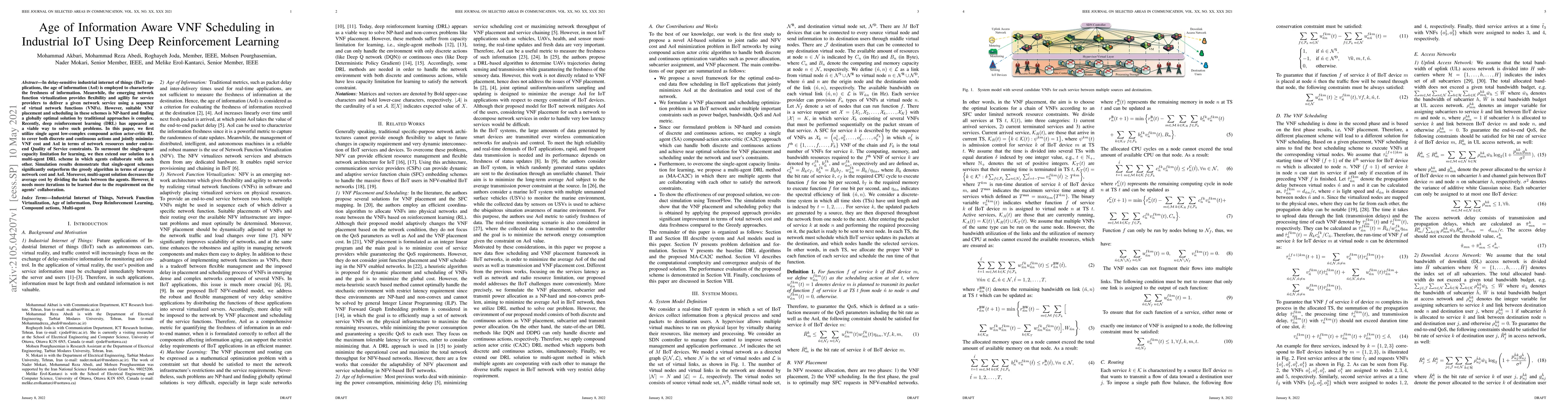 This paper proposes a deep reinforcement learning approach for scheduling virtual network functions (VNFs) in industrial IoT to minimize cost and age of information (AoI) while meeting Quality of Service constraints. Single-agent and multi-agent DRL schemes are developed, with the latter showing reduced average cost through task division but requiring more iterations for learning due to inter-agent collaboration.