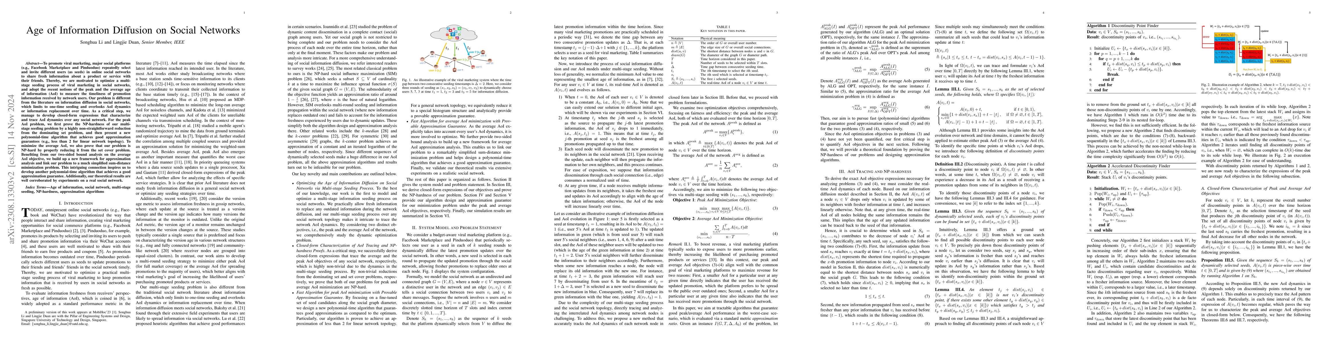 To promote viral marketing, major social platforms (e.g., Facebook Marketplace and Pinduoduo) repeatedly select and invite different users (as seeds) in online social networks to share fresh information about a product or service with their friends. Thereby, we are motivated to optimize a multi-stage seeding process of viral marketing in social networks and adopt the recent notions of the peak and the average age of information (AoI) to measure the timeliness of promotion information received by network users. Our problem is different from the literature on information diffusion in social networks, which limits to one-time seeding and overlooks AoI dynamics or information replacement over time. As a critical step, we manage to develop closed-form expressions that characterize and trace AoI dynamics over any social network. For the peak AoI problem, we first prove the NP-hardness of our multi-stage seeding problem by a highly non-straightforward reduction from the dominating set problem, and then present a new polynomial-time algorithm that achieves good approximation guarantees (e.g., less than 2 for linear network topology). To minimize the average AoI, we also prove that our problem is NP-hard by properly reducing it from the set cover problem. Benefiting from our two-side bound analysis on the average AoI objective, we build up a new framework for approximation analysis and link our problem to a much simplified sum-distance minimization problem. This intriguing connection inspires us to develop another polynomial-time algorithm that achieves a good approximation guarantee. Additionally, our theoretical results are well corroborated by experiments on a real social network.