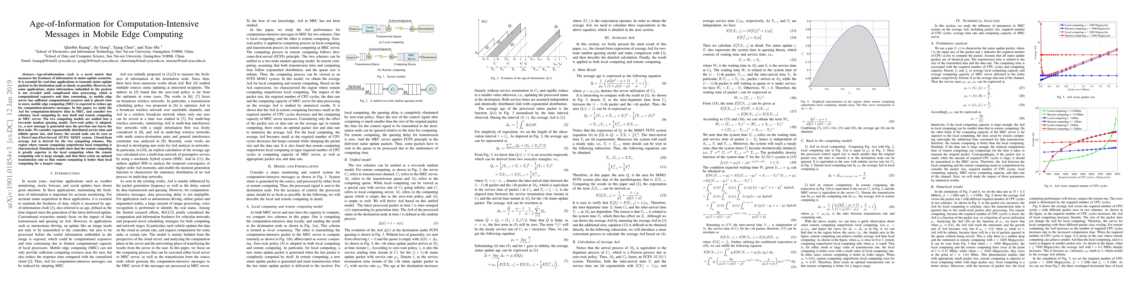 This paper investigates the age-of-information (AoI) for computation-intensive messages in mobile edge computing (MEC), comparing local and remote computing. It derives closed-form average AoI for both models and finds that remote computing via MEC servers is significantly superior when the processing rate is high, with an optimal transmission rate maximizing its benefits.