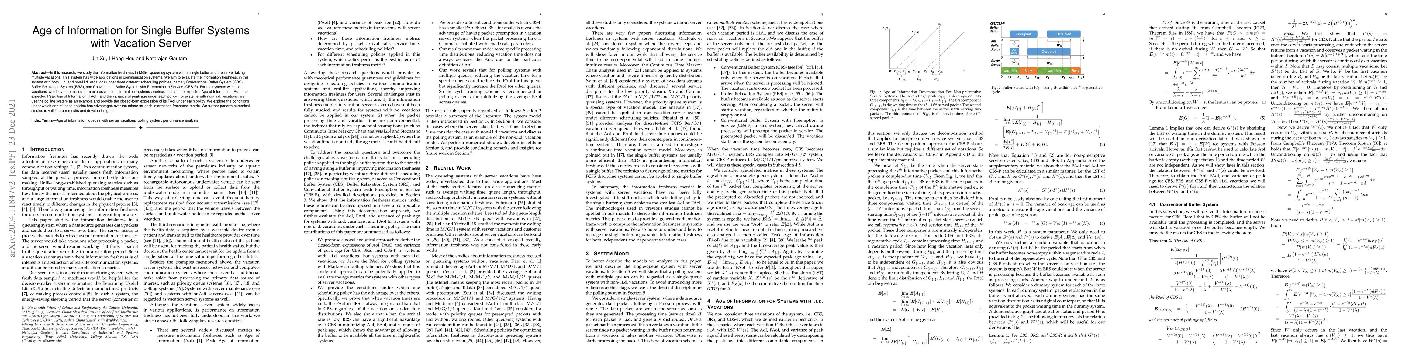 This research paper investigates information freshness in a queueing system with single buffer and vacation server, analyzing three scheduling policies and comparing their advantages for different metrics such as Age of Information and Peak Age of Information.