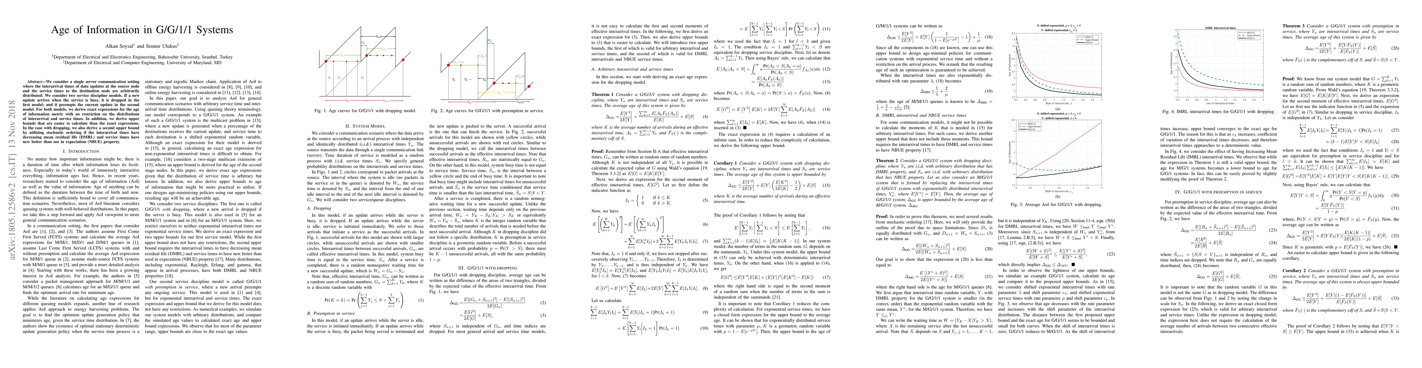 We consider a single server communication setting where the interarrival times of data updates at the source node and the service times to the destination node are arbitrarily distributed. We consider two service discipline models. If a new update arrives when the service is busy, it is dropped in the first model; and it preempts the current update in the second model. For both models, we derive exact expressions for the age of information metric with no restriction on the distributions of interarrival and service times. In addition, we derive upper bounds that are easier to calculate than the exact expressions. In the case with dropping, we also derive a second upper bound by utilizing stochastic ordering if the interarrival times have decreasing mean residual life (DMRL) and service times have new better than use in expectation (NBUE) property.