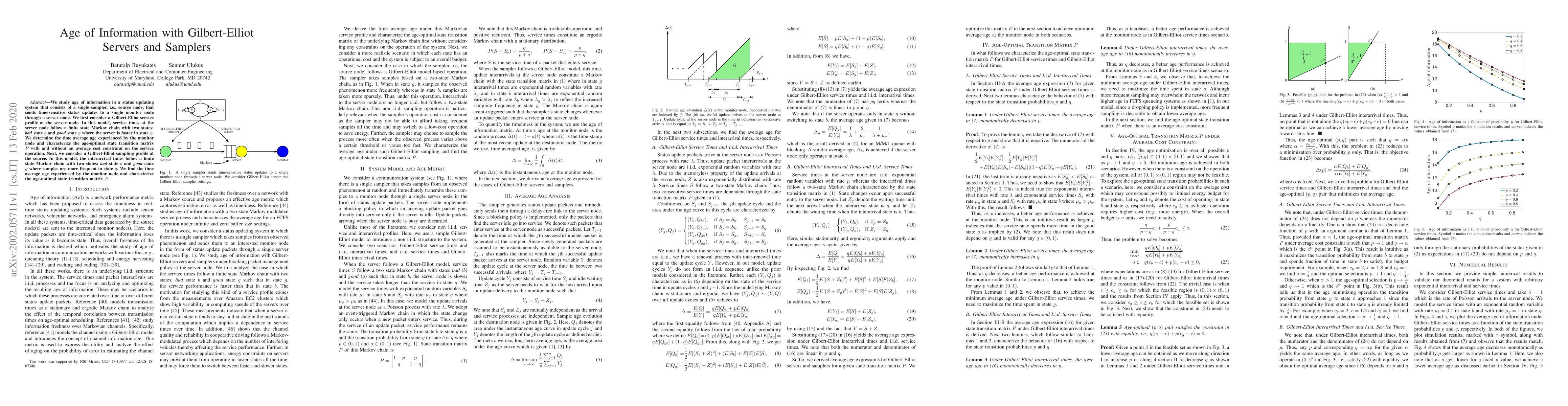 We study age of information in a status updating system that consists of a single sampler, i.e., source node, that sends time-sensitive status updates to a single monitor node through a server node. We first consider a Gilbert-Elliot service profile at the server node. In this model, service times at the server node follow a finite state Markov chain with two states: ${bad}$ state $b$ and ${good}$ state $g$ where the server is faster in state $g$. We determine the time average age experienced by the monitor node and characterize the age-optimal state transition matrix $P$ with and without an average cost constraint on the service operation. Next, we consider a Gilbert-Elliot sampling profile at the source. In this model, the interarrival times follow a finite state Markov chain with two states: ${bad}$ state $b$ and ${good}$ state $g$ where samples are more frequent in state $g$. We find the time average age experienced by the monitor node and characterize the age-optimal state transition matrix $P$.
