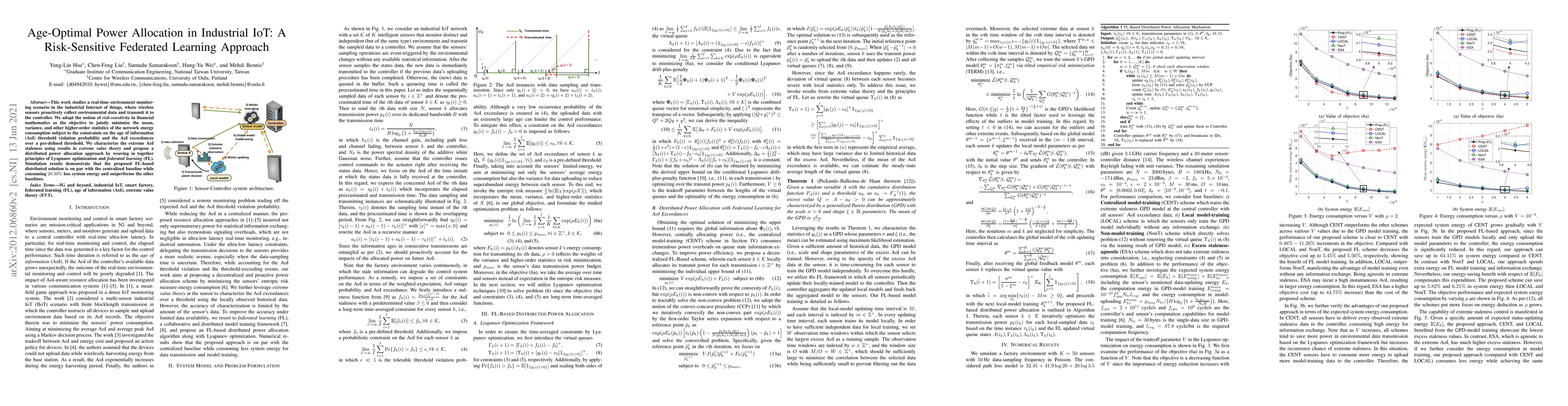 This paper proposes a risk-sensitive federated learning approach for real-time environmental monitoring in industrial IoT, aiming to optimize power allocation while minimizing network energy consumption and respecting age of information constraints. Simulation results show the distributed solution is energy-efficient and performs competitively compared to centralized methods.