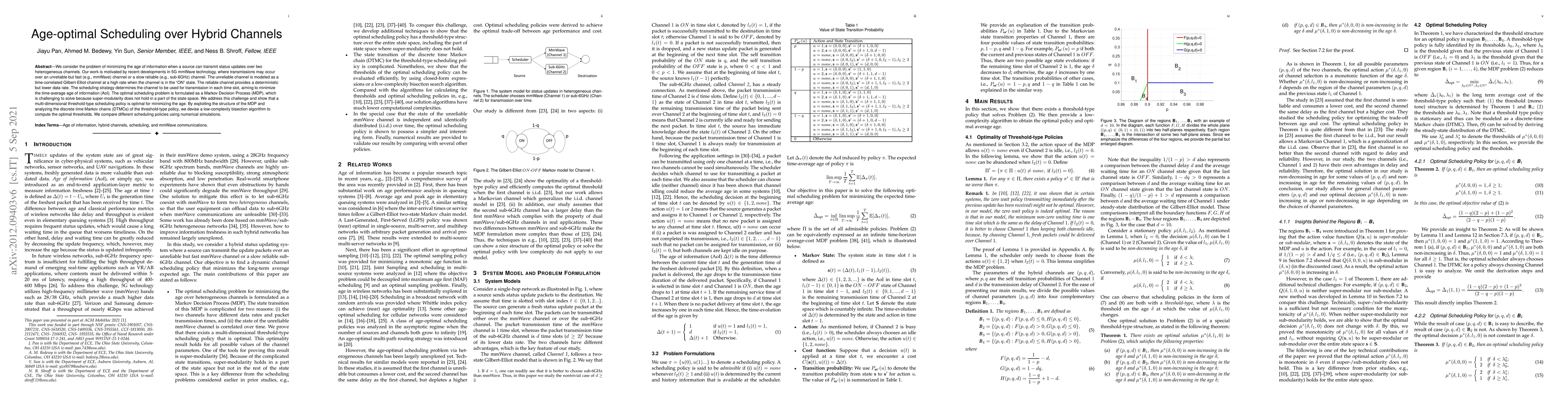 This paper addresses the optimal scheduling problem to minimize the age of information over two heterogeneous channels in 5G mmWave technology. It formulates the problem as a Markov Decision Process and proposes a multi-dimensional threshold-type policy, supported by a low-complexity bisection algorithm for threshold computation, to achieve optimal performance.