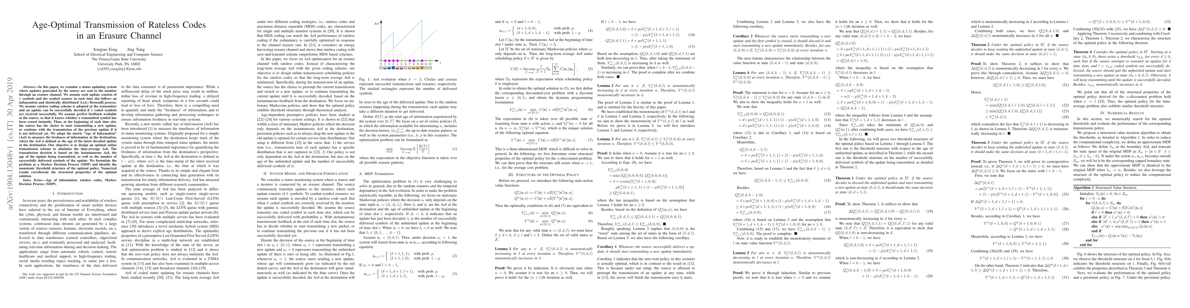 In this paper, we examine a status updating system where updates generated by the source are sent to the monitor through an erasure channel. We assume each update consists of $k$ symbols and the symbol erasure in each time slot follows an independent and identically distributed (i.i.d.) Bernoulli process. We assume rateless coding scheme is adopted at the transmitter and an update can be successfully decoded if $k$ coded symbols are received successfully. We assume perfect feedback available at the source, so that it knows whether a transmitted symbol has been erased instantly. Then, at the beginning of each time slot, the source has the choice to start transmitting a new update, or continue with the transmission of the previous update if it is not delivered yet. We adopt the metric "Age of Information" (AoI) to measure the freshness of information at the destination, where the AoI is defined as the age of the latest decoded update at the destination. Our objective is to design an optimal online transmission scheme to minimize the time-average AoI. The transmission decision is based on the instantaneous AoI, the age of the update being transmitted, as well as the number of successfully delivered symbols of the update. We formulate the problem as a Markov Decision Process (MDP) and identify the monotonic threshold structure of the optimal policy. Numerical results corroborate the structural properties of the optimal solution.