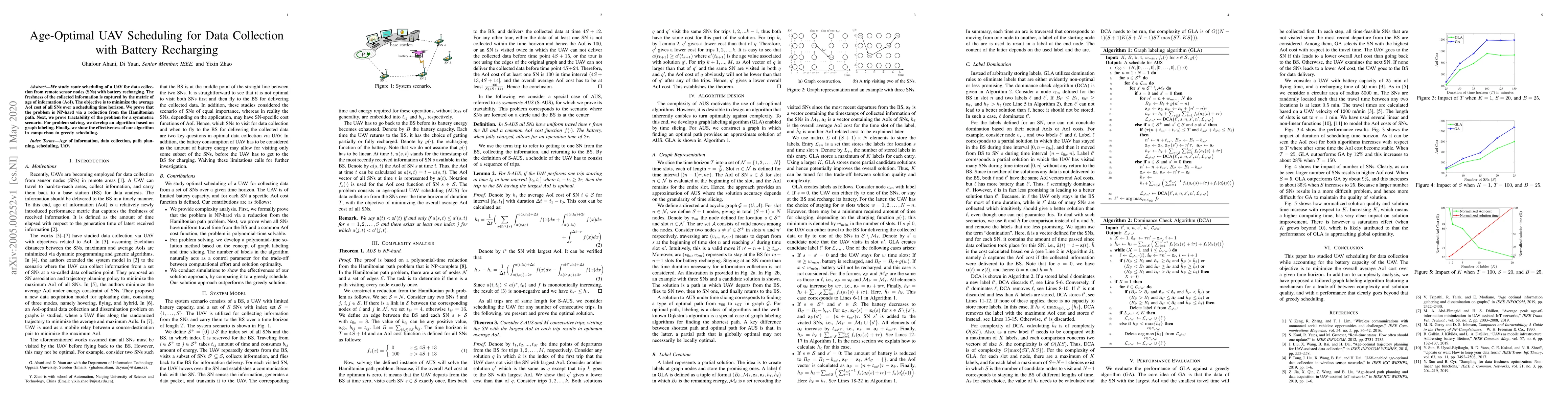 We study route scheduling of a UAV for data collec-tion from remote sensor nodes (SNs) with battery recharging. Thefreshness of the collected information is captured by the metric ofage of information (AoI). The objective is to minimize the averageAoI cost of all SNs over a scheduling time horizon. We prove thatthe problem is NP-hard via a reduction from the Hamiltonianpath. Next, we prove tractability of the problem for a symmetricscenario. For problem solving, we develop an algorithm based ongraph labeling. Finally, we show the effectiveness of our algorithmin comparison to greedy scheduling.