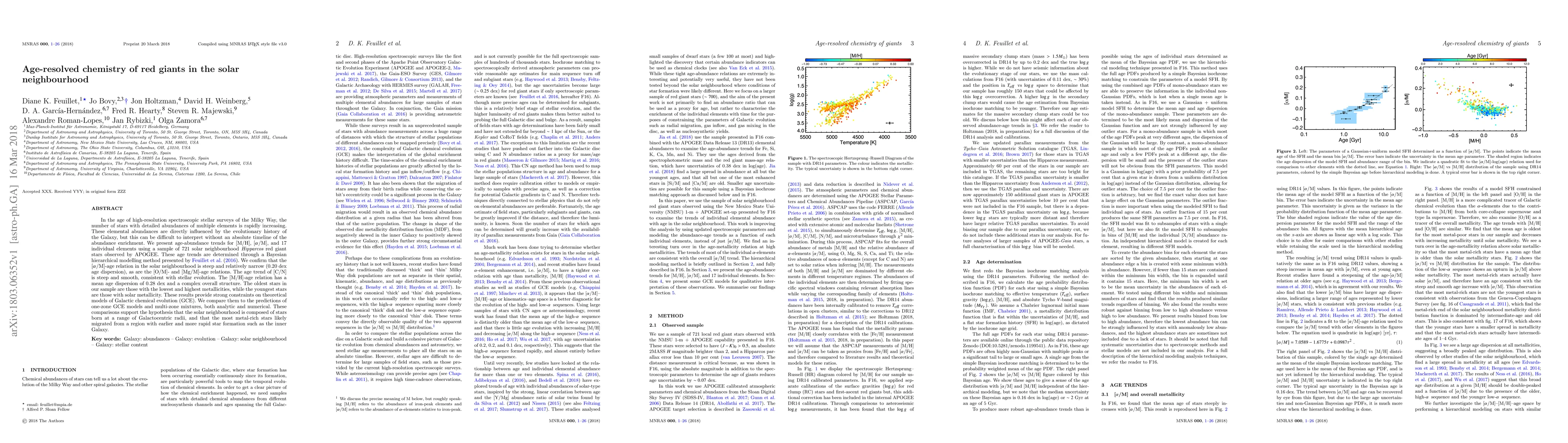 In the age of high-resolution spectroscopic stellar surveys of the Milky Way, the number of stars with detailed abundances of multiple elements is rapidly increasing. These elemental abundances are directly influenced by the evolutionary history of the Galaxy, but this can be difficult to interpret without an absolute timeline of the abundance enrichment. We present age-abundance trends for [M/H], [{\alpha}/M], and 17 individual elements using a sample of 721 solar neighbourhood Hipparcos red giant stars observed by APOGEE. These age trends are determined through a Bayesian hierarchical modelling method presented by Feuillet et al. (2016). We confirm that the [{\alpha}/M]- age relation in the solar neighbourhood is steep and relatively narrow (0.20 dex age dispersion), as are the [O/M]- and [Mg/M]-age relations. The age trend of [C/N] is steep and smooth, consistent with stellar evolution. The [M/H]-age relation has a mean age dispersion of 0.28 dex and a complex overall structure. The oldest stars in our sample are those with the lowest and highest metallicities, while the youngest stars are those with solar metallicity. These results provide strong constraints on theoretical models of Galactic chemical evolution (GCE). We compare them to the predictions of one-zone GCE mod- els and multi-zone mixtures, both analytic and numerical. These comparisons support the hypothesis that the solar neighbourhood is composed of stars born at a range of Galactocentric radii, and that the most metal-rich stars likely migrated from a region with earlier and more rapid star formation such as the inner Galaxy.