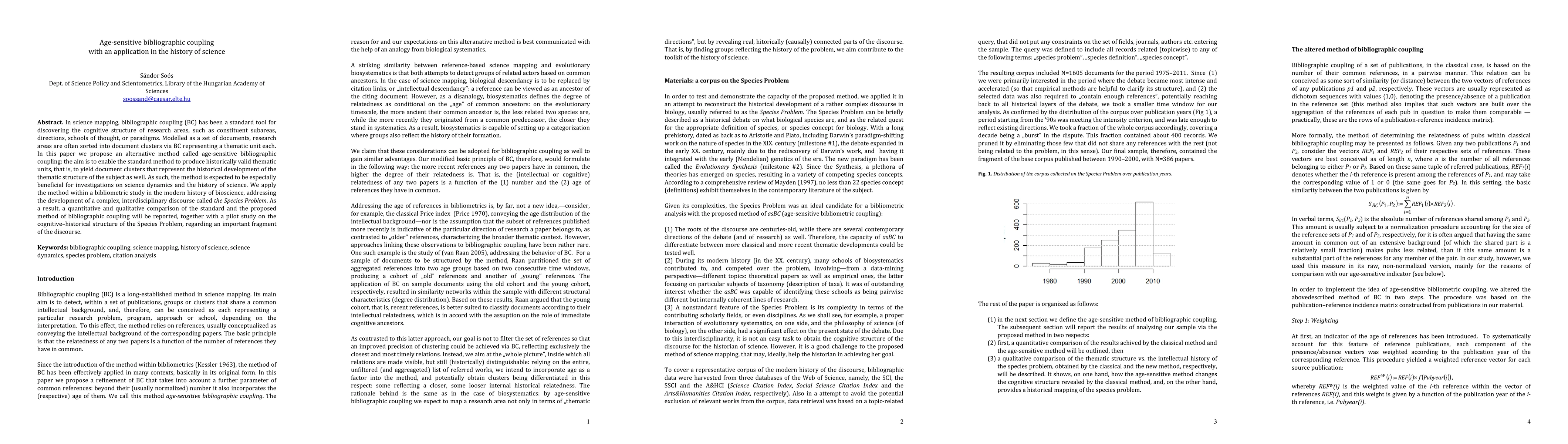 This paper introduces Age-sensitive Bibliographic Coupling (ABC), a method enhancing traditional bibliographic coupling to create historically valid thematic units in science mapping. Applied to the history of bioscience, ABC successfully traces the evolution of the Species Problem, aiding in understanding science dynamics and historical development in interdisciplinary fields.