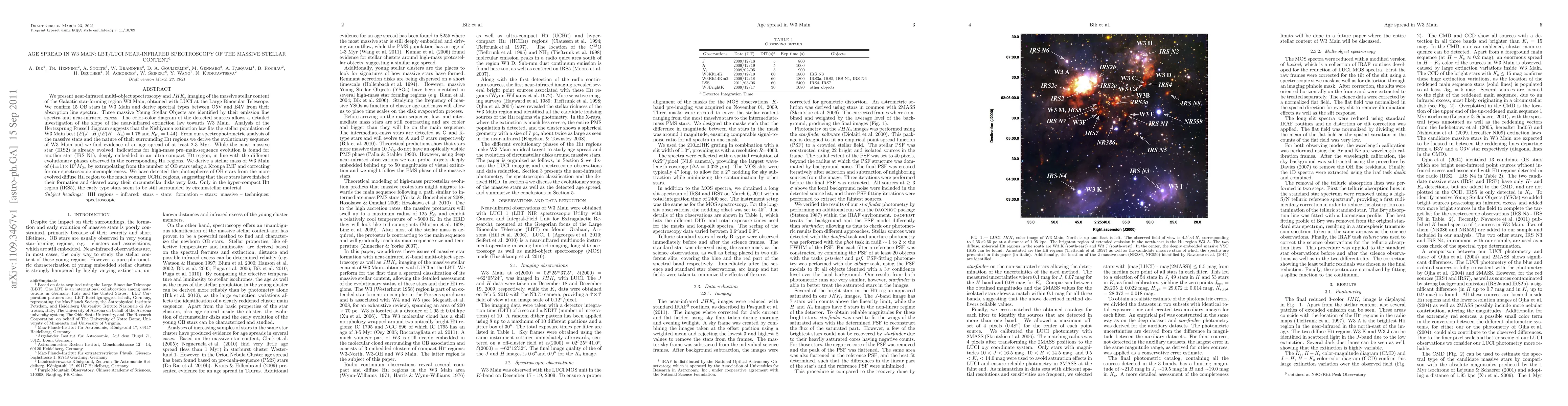 We present near-infrared multi-object spectroscopy and JHKs imaging of the massive stellar content of the Galactic star-forming region W3 Main, obtained with LUCI at the Large Binocular Telescope. We confirm 15 OB stars in W3 Main and derive spectral types between O5V and B4V from their absorption line spectra. Three massive Young Stellar Objects are identified by their emission line spectra and near-infrared excess. The color-color diagram of the detected sources allows a detailed investigation of the slope of the near-infrared extinction law towards W3 Main. Analysis of the Hertzsprung Russell diagram suggests that the Nishiyama extinction law fits the stellar population of W3 Main best (E(J-H)/E(H-Ks) = 1.76 and R_(Ks) = 1.44). From our spectrophotometric analysis of the massive stars and the nature of their surrounding HII regions we derive the evolutionary sequence of W3 Main and we find evidence of an age spread of at least 2-3 Myr. While the most massive star (IRS2) is already evolved, indications for high-mass pre-main-sequence evolution is found for another star (IRS N1), deeply embedded in an ultra compact HII region, in line with the different evolutionary phases observed in the corresponding HII regions. We derive a stellar mass of W3 Main of (4 +- 1) 10^3 Msun, by extrapolating from the number of OB stars using a Kroupa IMF and correcting for our spectroscopic incompleteness. We have detected the photospheres of OB stars from the more evolved diffuse HII region to the much younger UCHII regions, suggesting that these stars have finished their formation and cleared away their circumstellar disks very fast. Only in the hyper-compact HII region (IRS5), the early type stars seem to be still surrounded by circumstellar material.