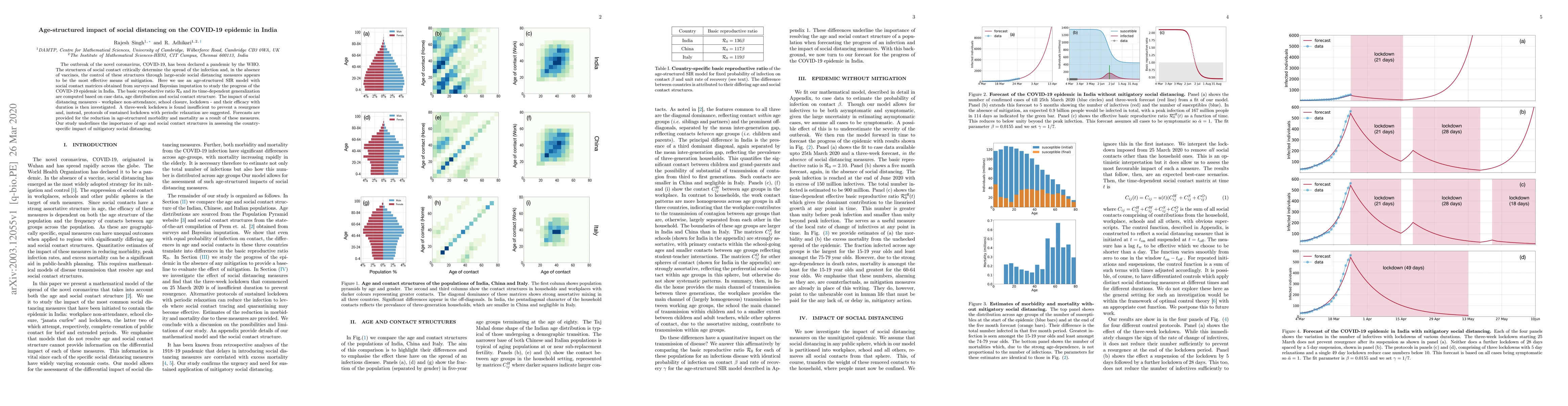 The outbreak of the novel coronavirus, COVID-19, has been declared a pandemic by the WHO. The structures of social contact critically determine the spread of the infection and, in the absence of vaccines, the control of these structures through large-scale social distancing measures appears to be the most effective means of mitigation. Here we use an age-structured SIR model with social contact matrices obtained from surveys and Bayesian imputation to study the progress of the COVID-19 epidemic in India. The basic reproductive ratio R0 and its time-dependent generalization are computed based on case data, age distribution and social contact structure. The impact of social distancing measures - workplace non-attendance, school closure, lockdown - and their efficacy with durations are then investigated. A three-week lockdown is found insufficient to prevent a resurgence and, instead, protocols of sustained lockdown with periodic relaxation are suggested. Forecasts are provided for the reduction in age-structured morbidity and mortality as a result of these measures. Our study underlines the importance of age and social contact structures in assessing the country-specific impact of mitigatory social distancing.