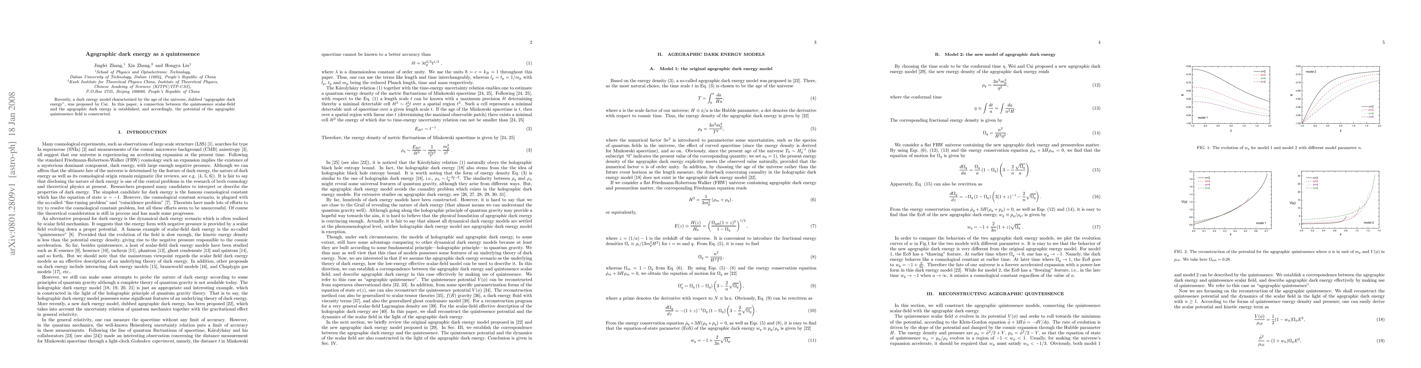 Summary: This paper establishes a connection between agegraphic dark energy, a model based on the universe's age, and quintessence, proposing a potential for the agegraphic quintessence field to describe dark energy.