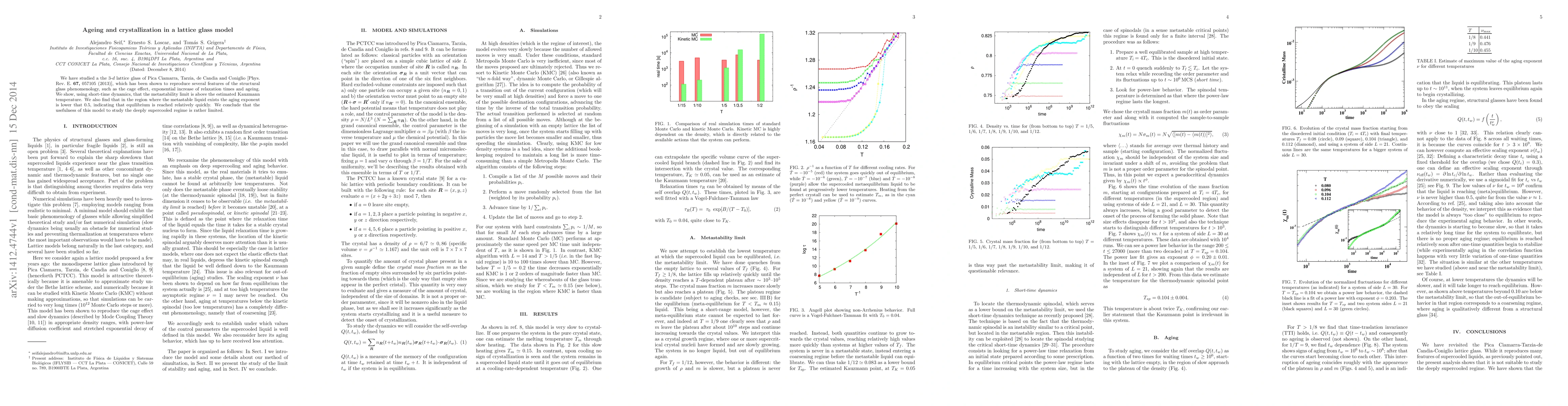 This study investigates the 3-$d$ lattice glass model by Pica Ciamarra et al., focusing on its aging and crystallization behavior. The research finds that the metastability limit exceeds the Kauzmann temperature, and the aging exponent is less than 0.5, suggesting that equilibrium is quickly reached, thus limiting the model's utility for studying the deeply supercooled regime.