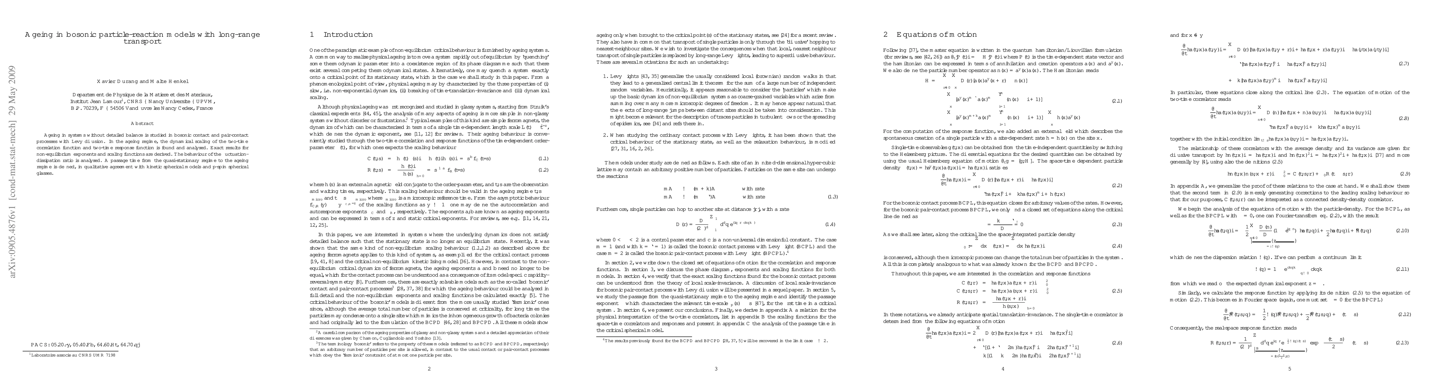 This paper investigates ageing phenomena in bosonic particle-reaction models without detailed balance, focusing on contact and pair-contact processes with Lévy diffusion. It derives exact results for non-equilibrium exponents and scaling functions, and analyses the fluctuation-dissipation ratio, finding a passage time from quasi-stationary to ageing regimes consistent with kinetic spherical models.