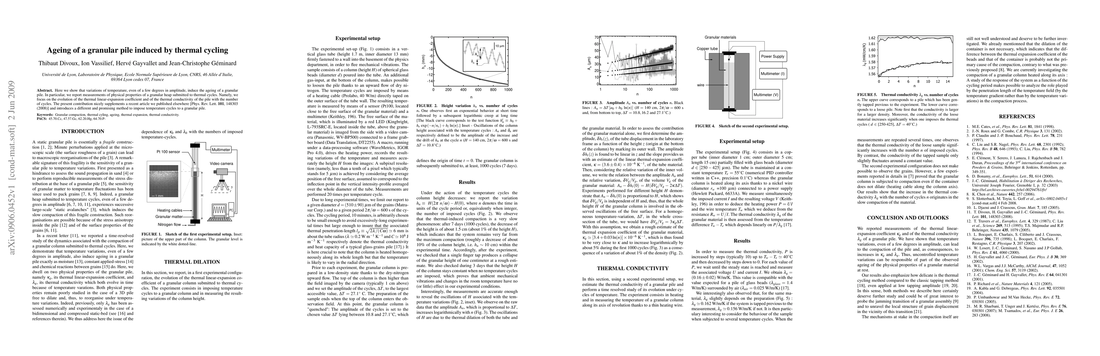 Here we show that variations of temperature, even of a few degrees in amplitude, induce the ageing of a granular pile. In particular, we report measurements of physical properties of a granular heap submitted to thermal cycles. Namely, we focus on the evolution of the thermal linear-expansion coefficient and of the thermal conductivity of the pile with the number of cycles. The present contribution nicely supplements a recent article we published elsewhere [Phys. Rev. Lett. \textbf{101}, 148303 (2008)] and introduces a different and promising method to impose temperature cycles to a granular pile.