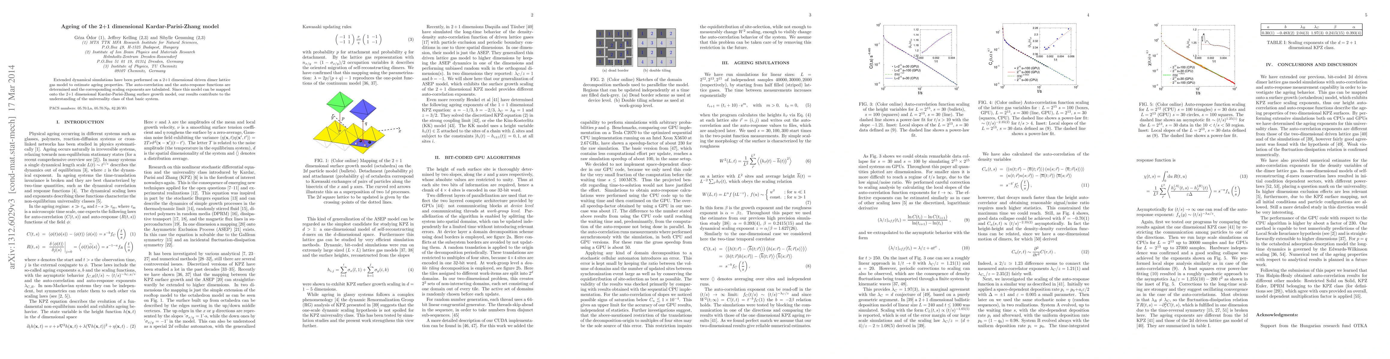 This paper investigates the ageing properties of a 2+1 dimensional driven dimer lattice gas model through extended dynamical simulations, determining auto-correlation and auto-response functions and their scaling exponents. The findings contribute to understanding the universality class of the 2+1 dimensional Kardar-Parisi-Zhang surface growth model.