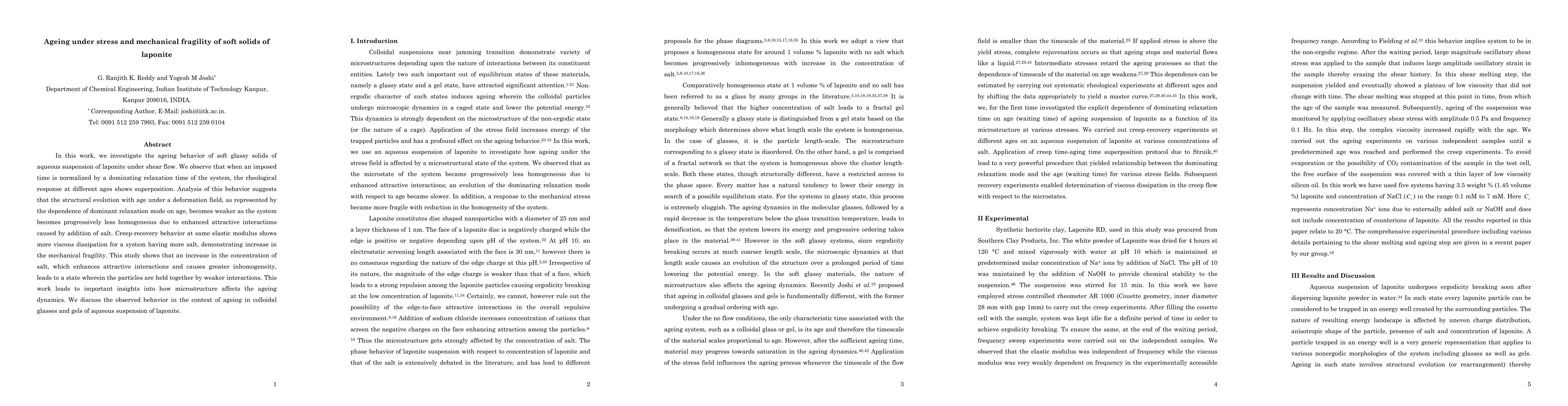 This study investigates the ageing behavior of laponite suspensions under shear flow, revealing that structural evolution weakens with age due to enhanced attractive interactions from salt addition. The research shows increased mechanical fragility and viscous dissipation in saltier systems, indicating that higher salt concentrations lead to weaker interactions and greater inhomogeneity in the microstructure.