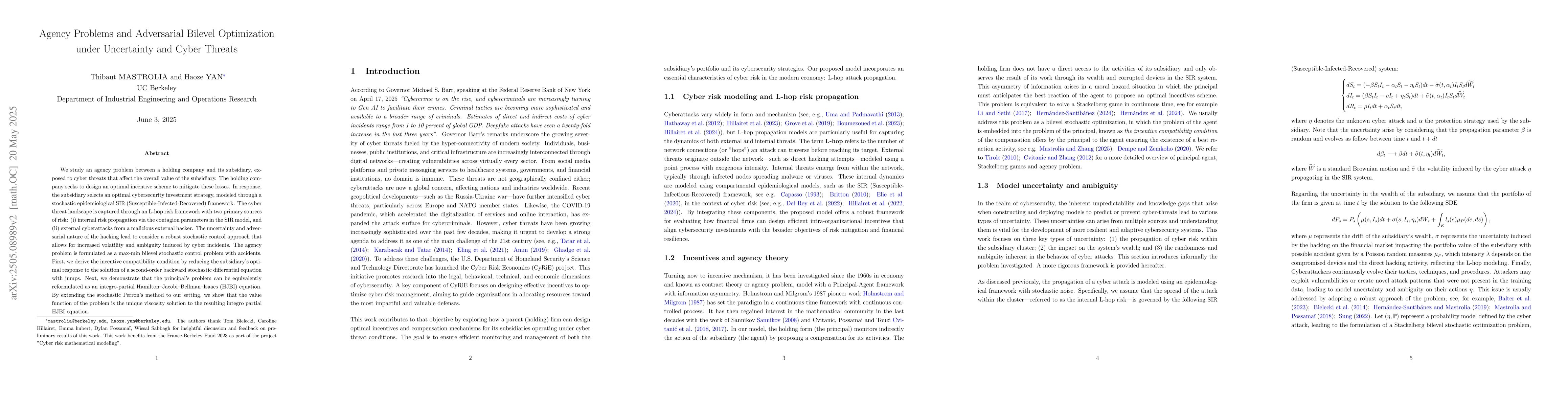 This work introduces a novel approach to bilevel optimization under uncertainty and adversarial cyber threats, providing a robust framework for agency problems in corporate cybersecurity.