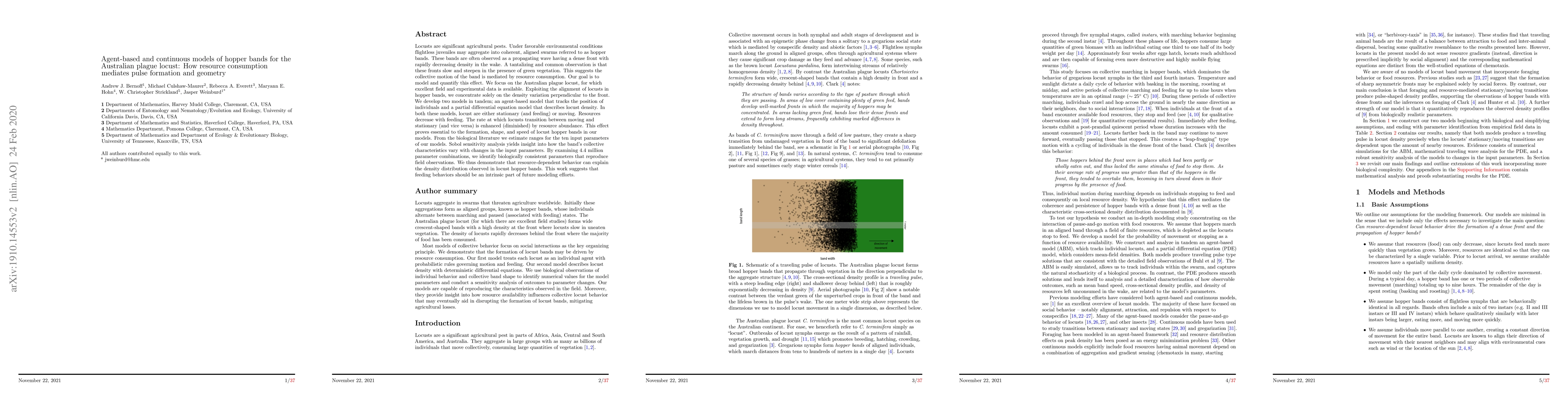 Locusts are significant agricultural pests. Under favorable environmental conditions flightless juveniles may aggregate into coherent, aligned swarms referred to as hopper bands. These bands are often observed as a propagating wave having a dense front with rapidly decreasing density in the wake. A tantalizing and common observation is that these fronts slow and steepen in the presence of green vegetation. This suggests the collective motion of the band is mediated by resource consumption. Our goal is to model and quantify this effect. We focus on the Australian plague locust, for which excellent field and experimental data is available. Exploiting the alignment of locusts in hopper bands, we concentrate solely on the density variation perpendicular to the front. We develop two models in tandem; an agent-based model that tracks the position of individuals and a partial differential equation model that describes locust density. In both these models, locust are either stationary (and feeding) or moving. Resources decrease with feeding. The rate at which locusts transition between moving and stationary (and vice versa) is enhanced (diminished) by resource abundance. This effect proves essential to the formation, shape, and speed of locust hopper bands in our models. From the biological literature we estimate ranges for the ten input parameters of our models. Sobol sensitivity analysis yields insight into how the band's collective characteristics vary with changes in the input parameters. By examining 4.4 million parameter combinations, we identify biologically consistent parameters that reproduce field observations. We thus demonstrate that resource-dependent behavior can explain the density distribution observed in locust hopper bands. This work suggests that feeding behaviors should be an intrinsic part of future modeling efforts.