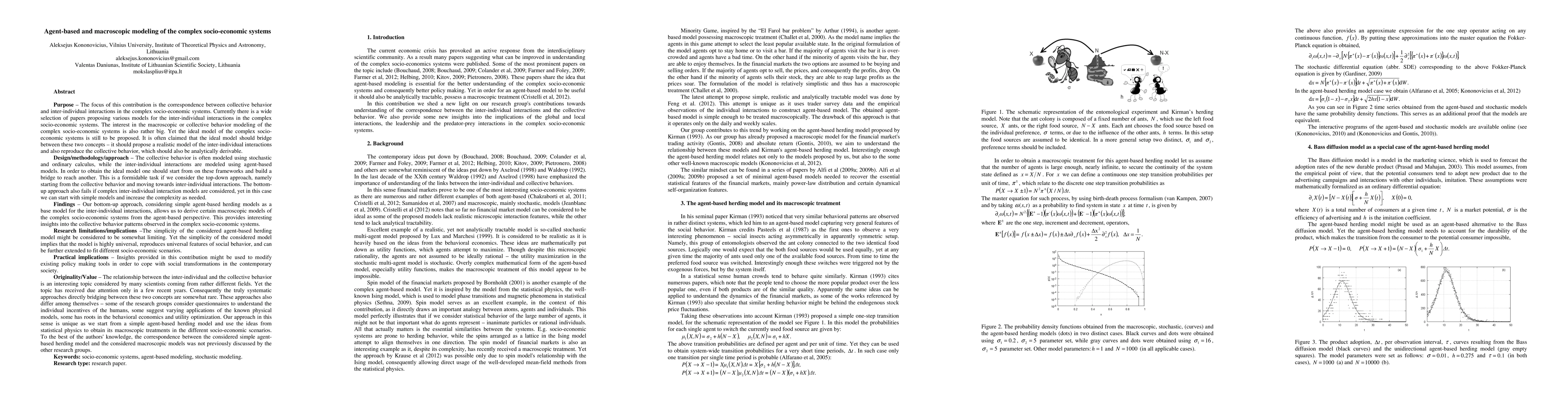 The current economic crisis has provoked an active response from the interdisciplinary scientific community. As a result many papers suggesting what can be improved in understanding of the complex socio-economics systems were published. Some of the most prominent papers on the topic include (Bouchaud, 2009; Farmer and Foley, 2009; Farmer et al, 2012; Helbing, 2010; Pietronero, 2008). These papers share the idea that agent-based modeling is essential for the better understanding of the complex socio-economic systems and consequently better policy making. Yet in order for an agent-based model to be useful it should also be analytically tractable, possess a macroscopic treatment (Cristelli et al, 2012). In this work we shed a new light on our research group's contributions towards understanding of the correspondence between the inter-individual interactions and collective behavior. We also provide some new insights into the implications of the global and local interactions, the leadership and the predator-prey interactions in the complex socio-economic systems.