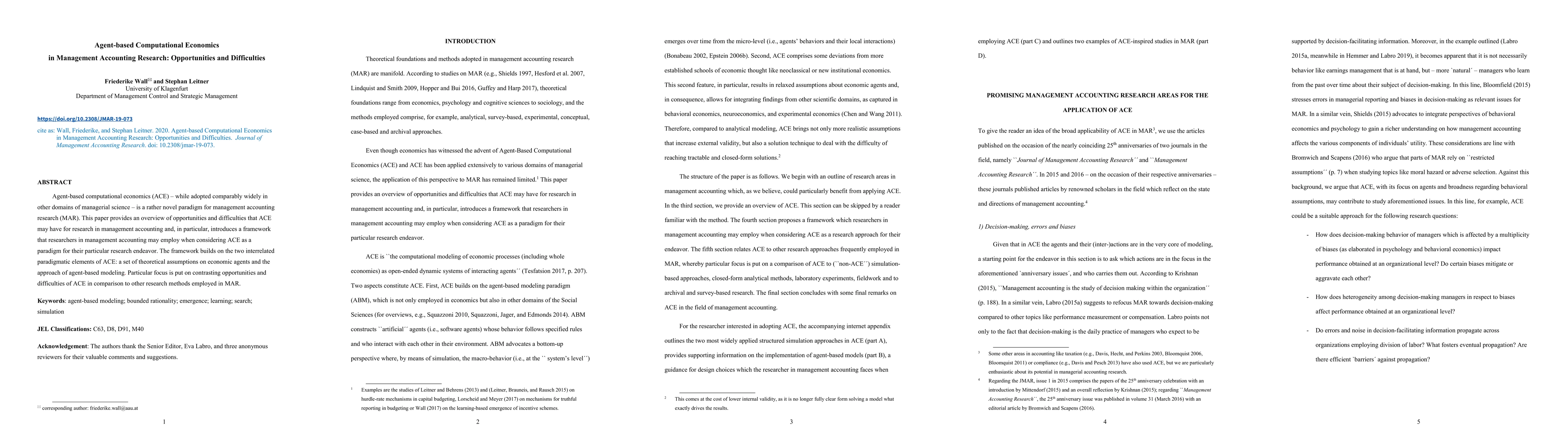 This paper explores the application of Agent-based Computational Economics (ACE) in Management Accounting Research, highlighting its opportunities and challenges. It proposes a framework for researchers to consider ACE, contrasting it with other research methods, focusing on theoretical assumptions of economic agents and the agent-based modeling approach.
