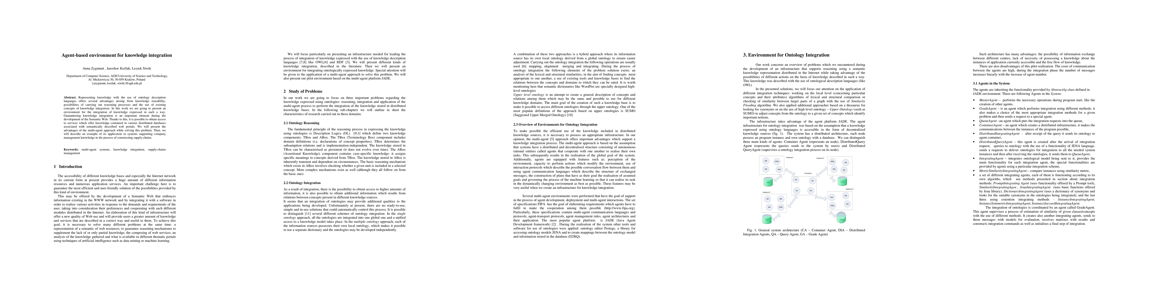 Representing knowledge with the use of ontology description languages offers several advantages arising from knowledge reusability, possibilities of carrying out reasoning processes and the use of existing concepts of knowledge integration. In this work we are going to present an environment for the integration of knowledge expressed in such a way. Guaranteeing knowledge integration is an important element during the development of the Semantic Web. Thanks to this, it is possible to obtain access to services which offer knowledge contained in various distributed databases associated with semantically described web portals. We will present the advantages of the multi-agent approach while solving this problem. Then, we will describe an example of its application in systems supporting company management knowledge in the process of constructing supply-chains.