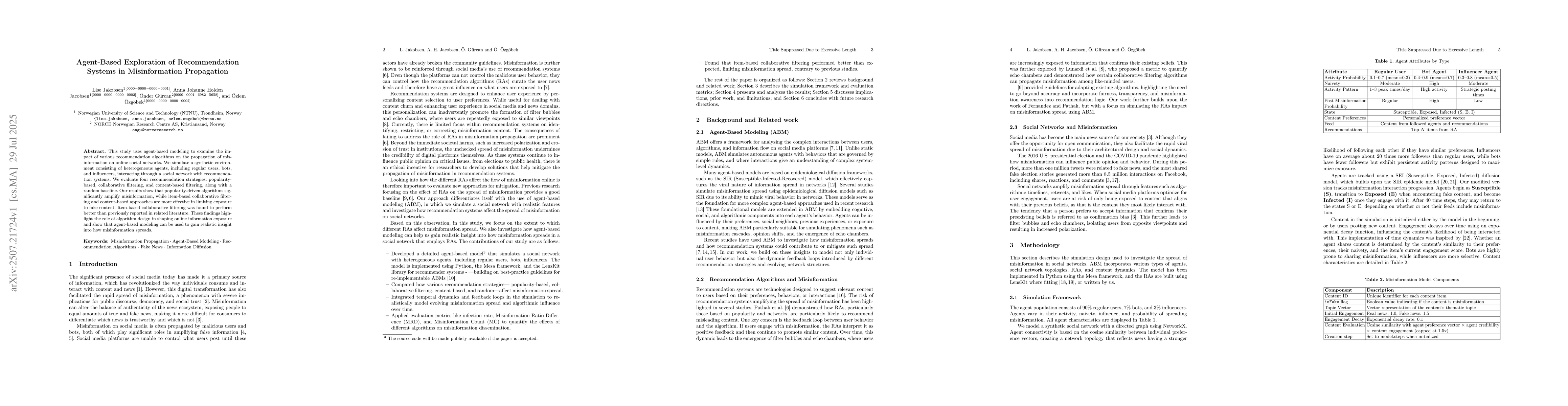 This study uses agent-based modeling to examine the impact of various recommendation algorithms on the propagation of misinformation on online social networks. We simulate a synthetic environment consisting of heterogeneous agents, including regular users, bots, and influencers, interacting through a social network with recommendation systems. We evaluate four recommendation strategies: popularity-based, collaborative filtering, and content-based filtering, along with a random baseline. Our results show that popularity-driven algorithms significantly amplify misinformation, while item-based collaborative filtering and content-based approaches are more effective in limiting exposure to fake content. Item-based collaborative filtering was found to perform better than previously reported in related literature. These findings highlight the role of algorithm design in shaping online information exposure and show that agent-based modeling can be used to gain realistic insight into how misinformation spreads.