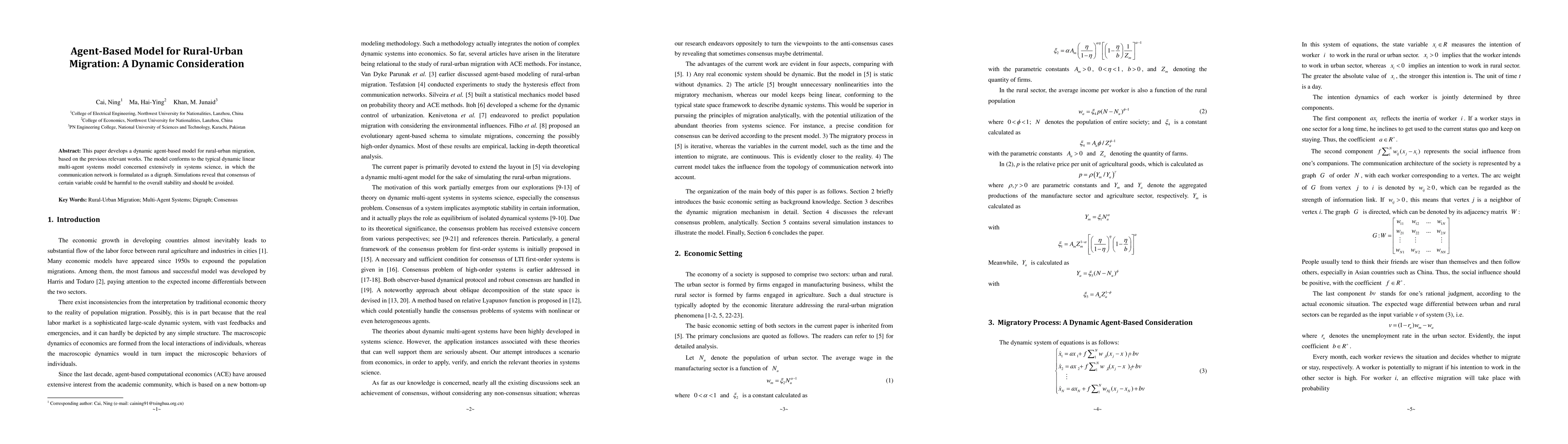 This paper develops a dynamic agent-based model for rural-urban migration, based on the previous relevant works. The model conforms to the typical dynamic linear multi-agent systems model concerned extensively in systems science, in which the communication network is formulated as a digraph. Simulations reveal that consensus of certain variable could be harmful to the overall stability and should be avoided.