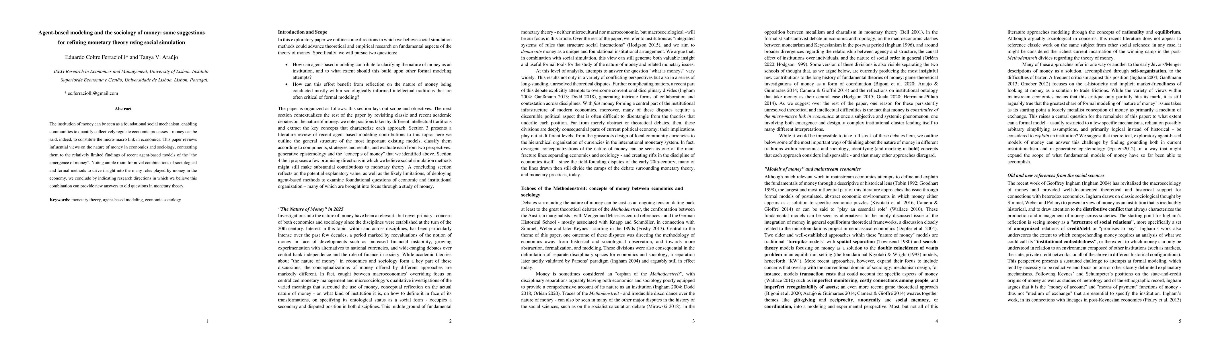 The institution of money can be seen as a foundational social mechanism, enabling communities to quantify collectively regulate economic processes. Money can be said, indeed, to constitute the micro-macro link in economics. This paper reviews influential views on the nature of money in economics and sociology, contrasting them to the relatively limited findings of recent agent-based models of "the emergence of money". Noting ample room for novel combinations of sociological and formal methods to drive insight into the many roles played by money in the economy, we conclude by indicating research directions in which we believe this combination can provide new answers to old questions in monetary theory