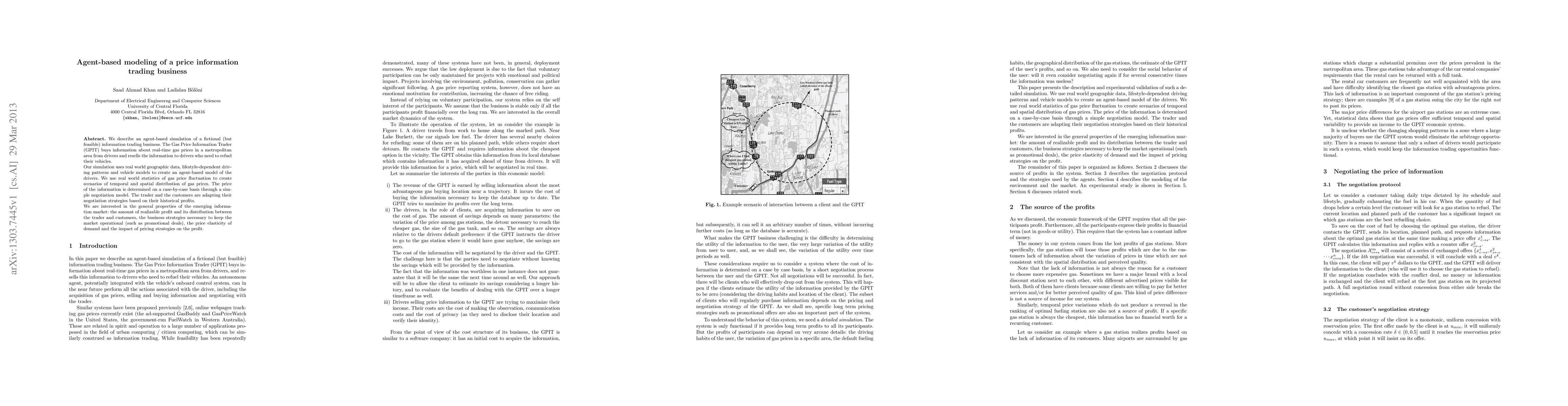 An agent-based simulation models a price information trading business where drivers buy and sell real-time gas prices, allowing researchers to study market dynamics and profit distribution. The study aims to understand the impact of pricing strategies on profit and identify necessary business strategies for the market to remain operational.