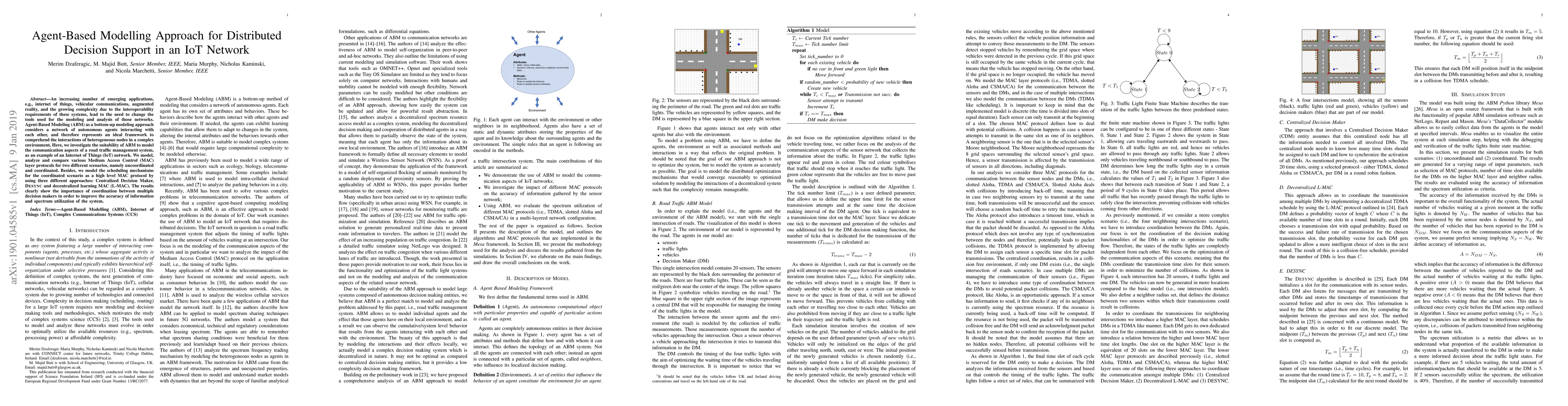 This research applies Agent-Based Modeling (ABM) to study communication in Internet of Things (IoT) networks, specifically a road traffic management system. The study models and compares various Medium Access Control (MAC) protocols in coordinated and uncoordinated scenarios, using centralized, decentralized learning, and desynchronized scheduling approaches. The findings highlight the significance of coordination among decision-makers for enhancing information accuracy and spectrum utilization in such systems.