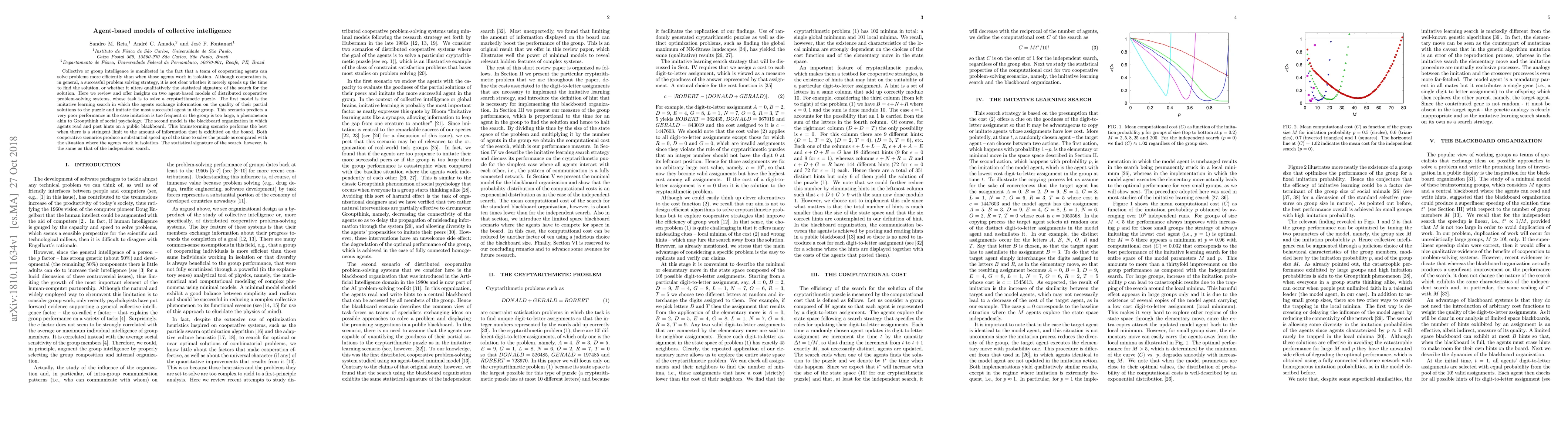 Collective or group intelligence is manifested in the fact that a team of cooperating agents can solve problems more efficiently than when those agents work in isolation. Although cooperation is, in general, a successful problem solving strategy, it is not clear whether it merely speeds up the time to find the solution, or whether it alters qualitatively the statistical signature of the search for the solution. Here we review and offer insights on two agent-based models of distributed cooperative problem-solving systems, whose task is to solve a cryptarithmetic puzzle. The first model is the imitative learning search in which the agents exchange information on the quality of their partial solutions to the puzzle and imitate the most successful agent in the group. This scenario predicts a very poor performance in the case imitation is too frequent or the group is too large, a phenomenon akin to Groupthink of social psychology. The second model is the blackboard organization in which agents read and post hints on a public blackboard. This brainstorming scenario performs the best when there is a stringent limit to the amount of information that is exhibited on the board. Both cooperative scenarios produce a substantial speed up of the time to solve the puzzle as compared with the situation where the agents work in isolation. The statistical signature of the search, however, is the same as that of the independent search.
