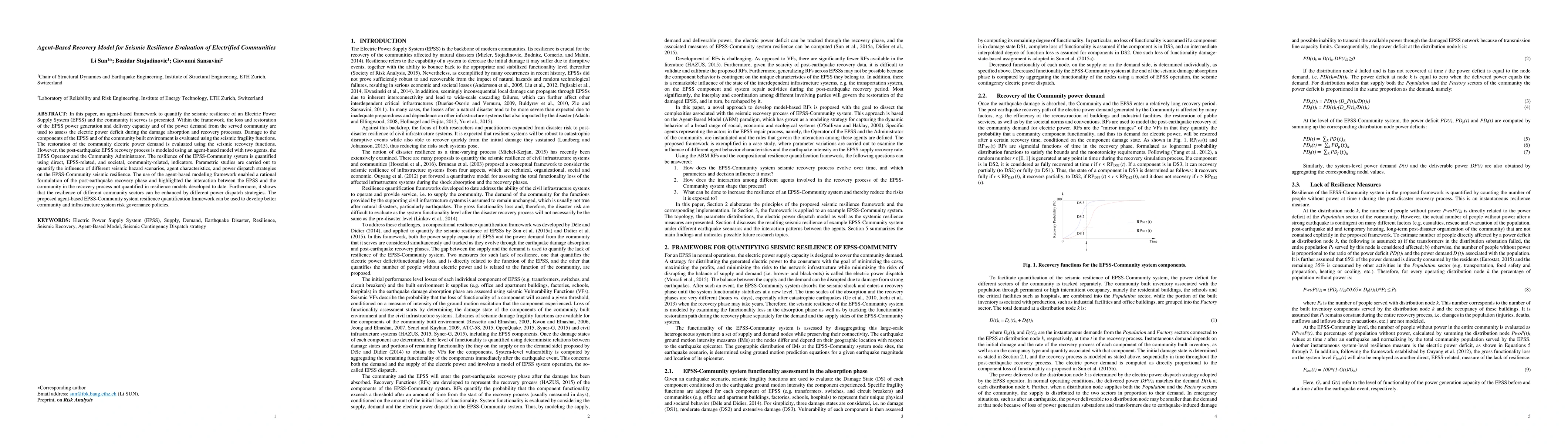 This paper introduces an agent-based framework to evaluate the seismic resilience of an Electric Power Supply System (EPSS) and the community it serves, using agent interactions to model recovery processes and quantify resilience through various indicators. The framework highlights the impact of different recovery strategies and hazard scenarios on system resilience, offering insights for improved risk governance policies.