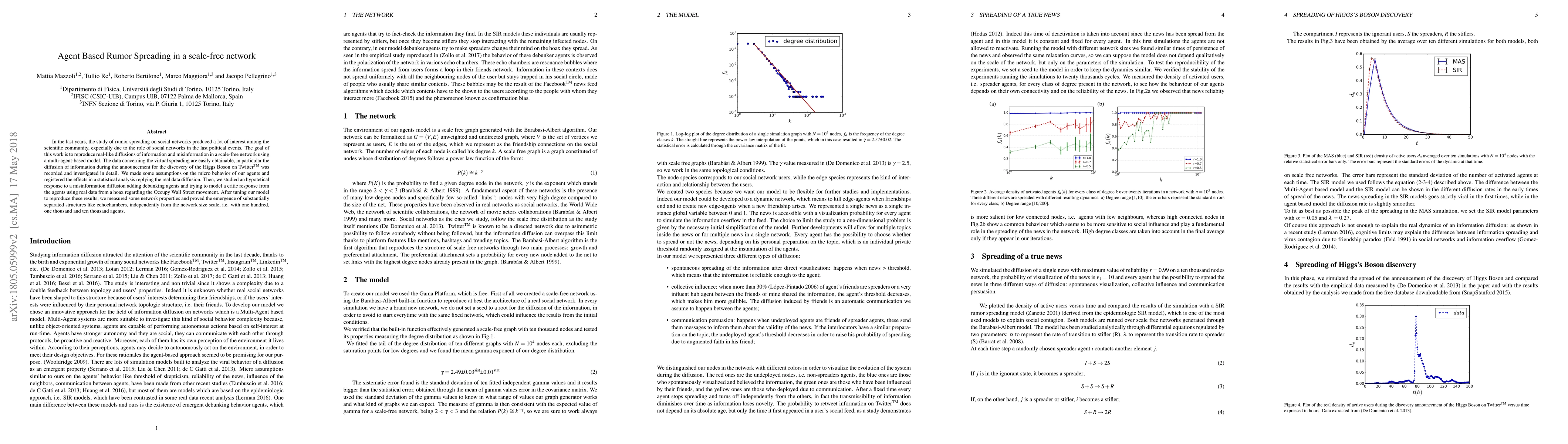 In the last years, the study of rumor spreading on social networks produced a lot of interest among the scientific community, expecially due to the role of social networks in the last political events. The goal of this work is to reproduce real-like diffusions of information and misinformation in a scale-free network using a multi-agent-based model. The data concerning the virtual spreading are easily obtainable, in particular the diffusion of information during the announcement for the discovery of the Higgs Boson on Twitter was recorded and investigated in detail. We made some assumptions on the micro behavior of our agents and registered the effects in a statistical analysis replying the real data diffusion. Then, we studied an hypotetical response to a misinformation diffusion adding debunking agents and trying to model a critic response from the agents using real data from a hoax regarding the Occupy Wall Street movement. After tuning our model to reproduce these results, we measured some network properties and proved the emergence of substantially separated structures like echochambers, independently from the network size scale, i.e. with one hundred, one thousand and ten thousand agents.