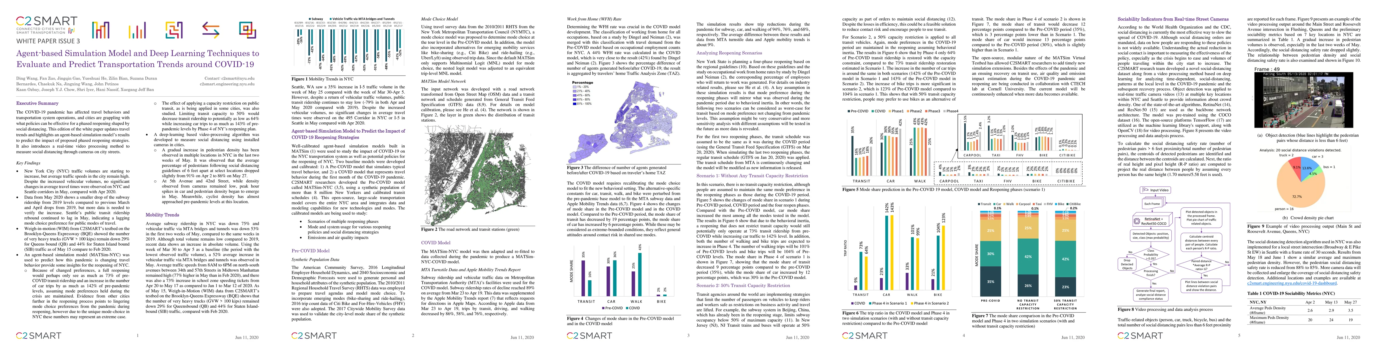 The COVID-19 pandemic has affected travel behaviors and transportation system operations, and cities are grappling with what policies can be effective for a phased reopening shaped by social distancing. This edition of the white paper updates travel trends and highlights an agent-based simulation model's results to predict the impact of proposed phased reopening strategies. It also introduces a real-time video processing method to measure social distancing through cameras on city streets.